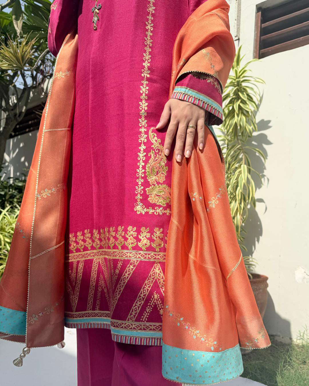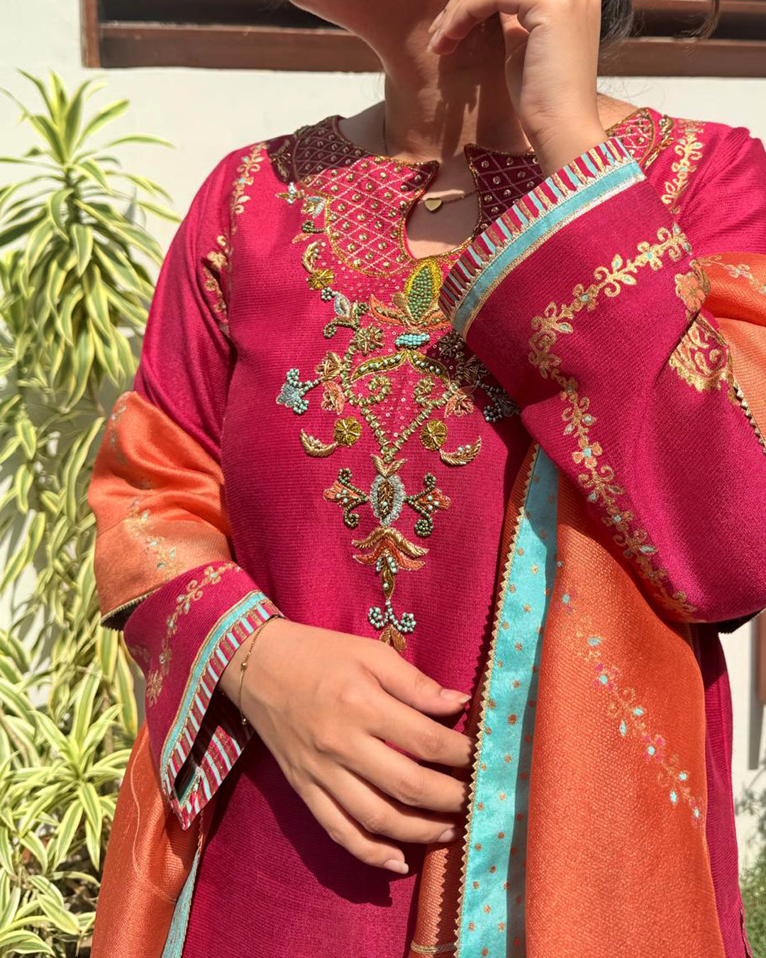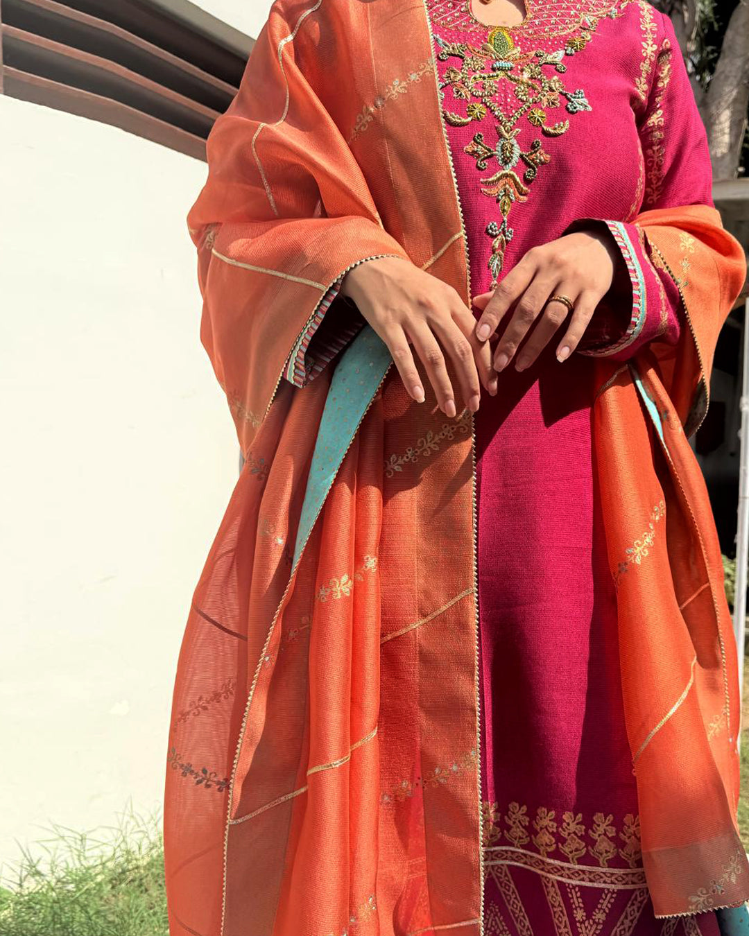Crafted from luxurious sheesha silk, ASMARA features handwork detailing on the neckline with block print detailing on the sleeves and dupatta. Its exquisite block print is beautifully complemented by vibrant festive colors, making it an impeccable choice for mehndi occasions. This thoughtfully designed fabric combines tradition with sophistication for a truly standout look.