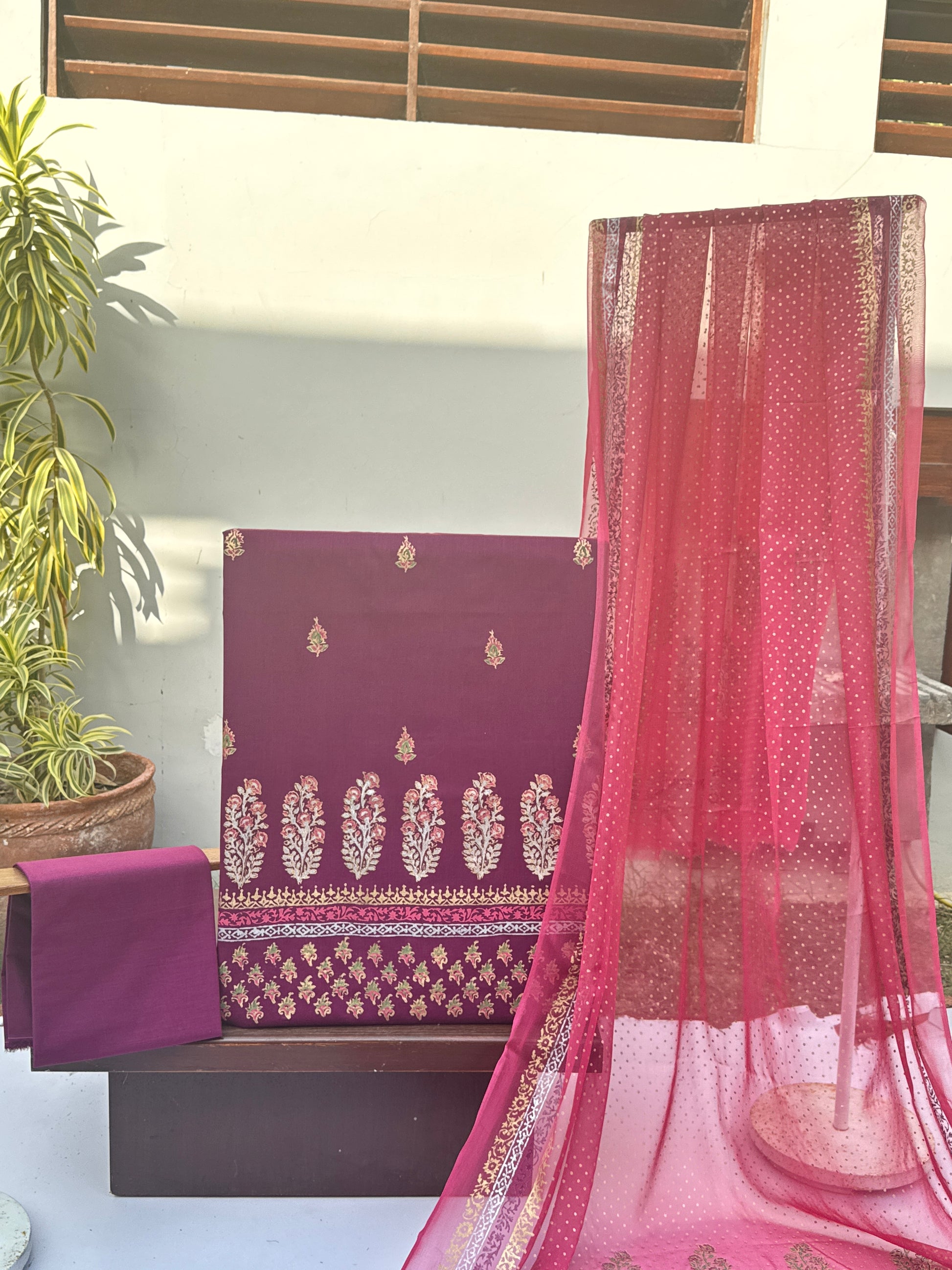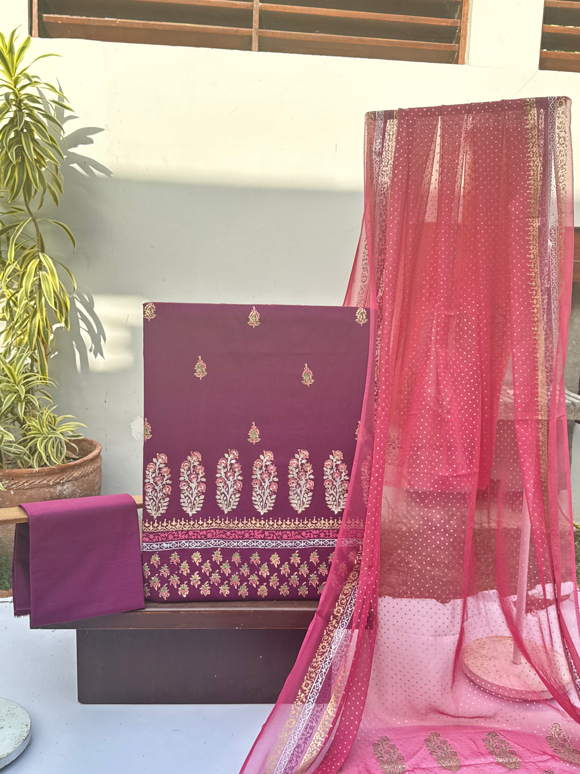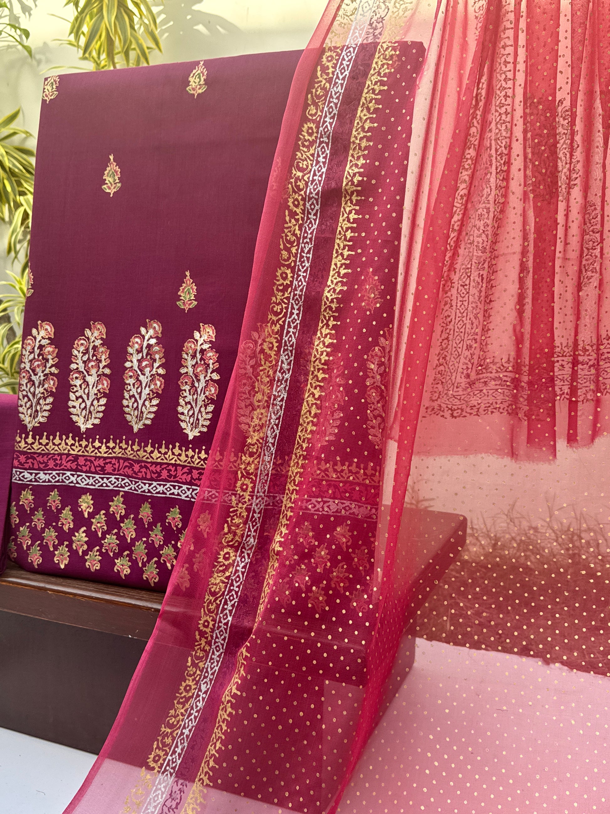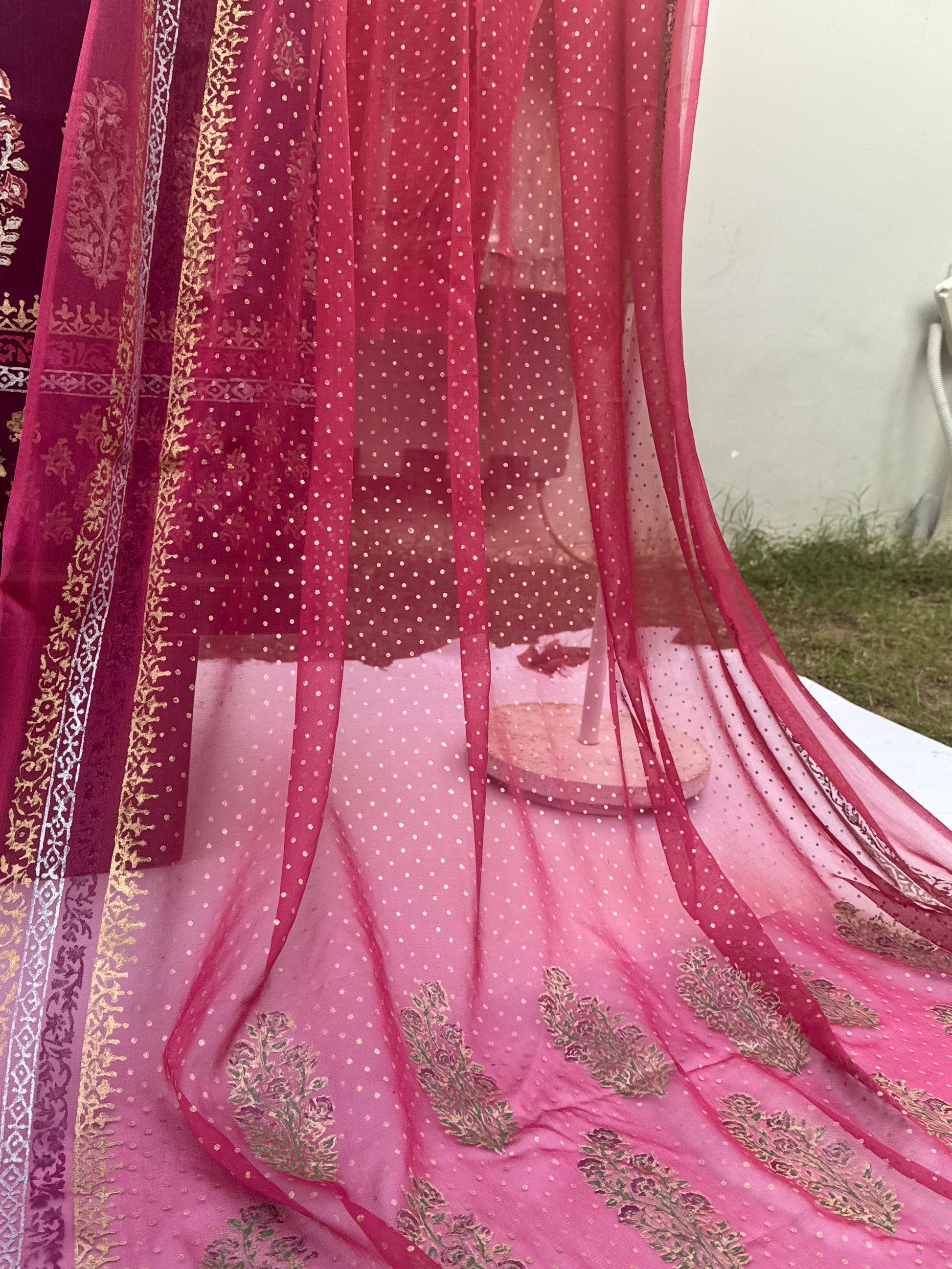 Add a touch of elegance to your wardrobe with our BURGUNDY ensemble. This set includes a 3-meter block printed cotton shirt, 2.5-meter matching pants, and a 2.75-meter rust pink block printed dupatta chiffon silk. Style and comfort combined to elevate your looks. Perfect for any occasion.