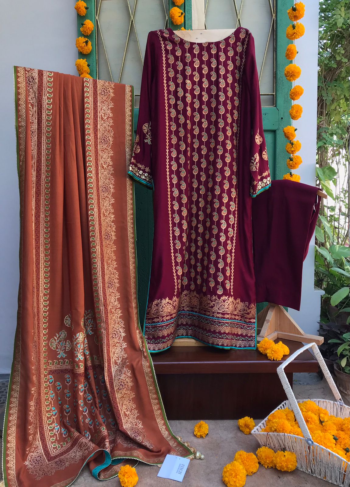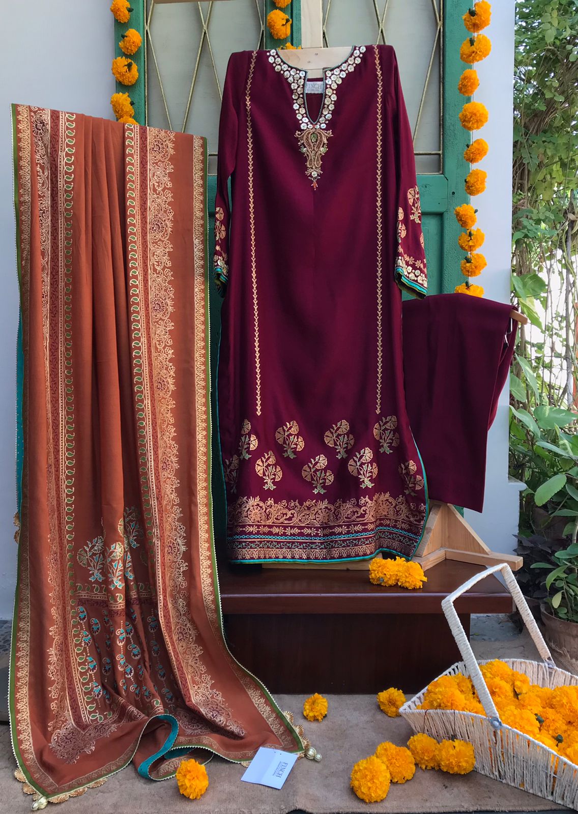 Make a statement in this stunning burgundy silk suit with hand-block printed design. Its intricate pattern adds a unique flair to any special event, ensuring you stand out with effortless elegance. Crafted with quality silk and intricate craftsmanship, this suit is perfect for your next event.
