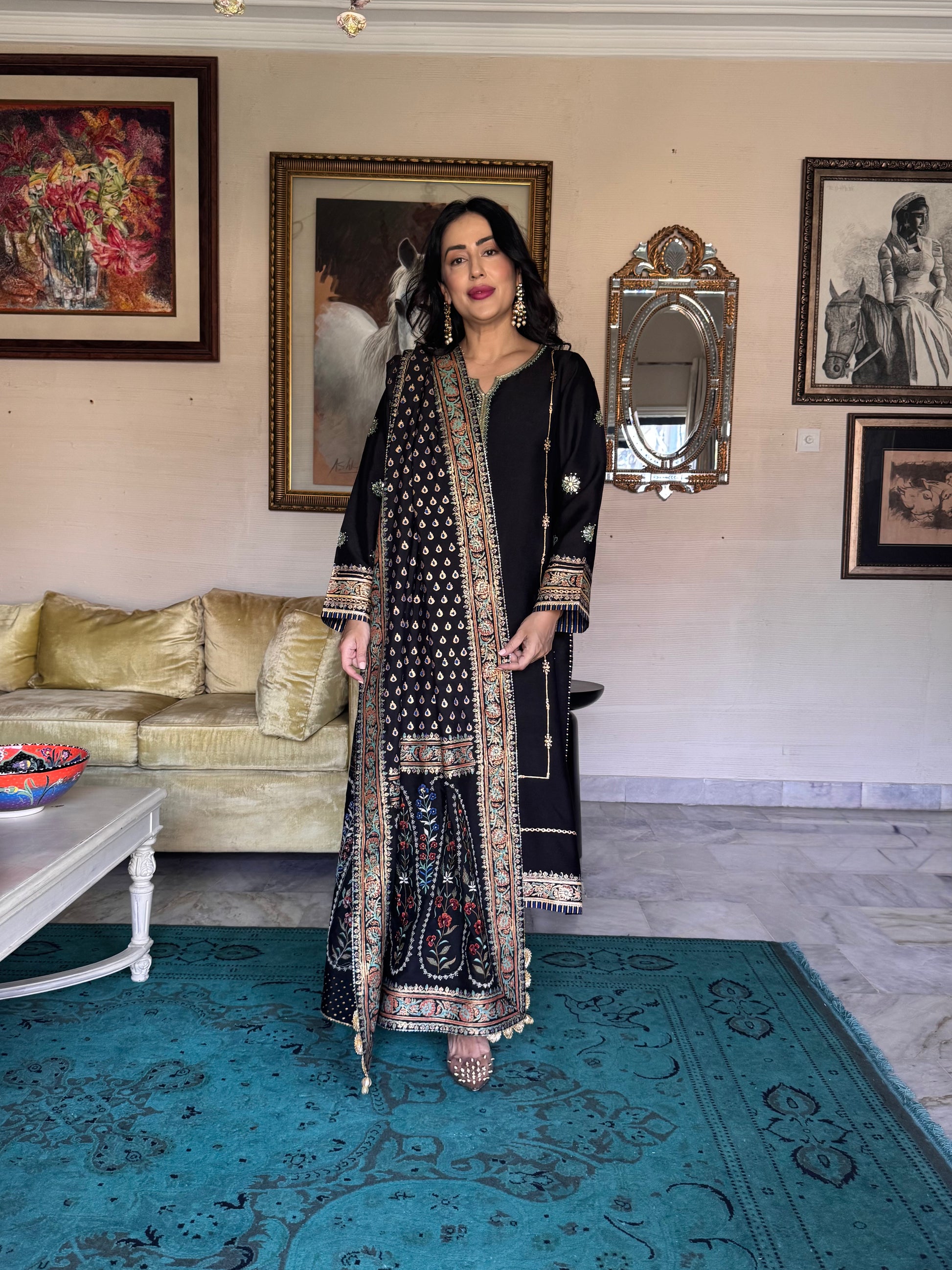 Introducing Chandni-Black, an exquisite ensemble that celebrates traditional craftsmanship. The black sheesha silk shirt features intricate kamdaani work layered over delicate block-printed patterns, while the hand-embroidered neckline adds refined elegance. Paired with a luxurious heavy sheesh a silk dupatta showcasing an embroidered pallu and block-printed center, this collection merges heritage artistry with contemporary silhouettes. Complete the look with tailored culottes for a sophisticated, timeless aesthetic that honors Pakistani textile traditions.