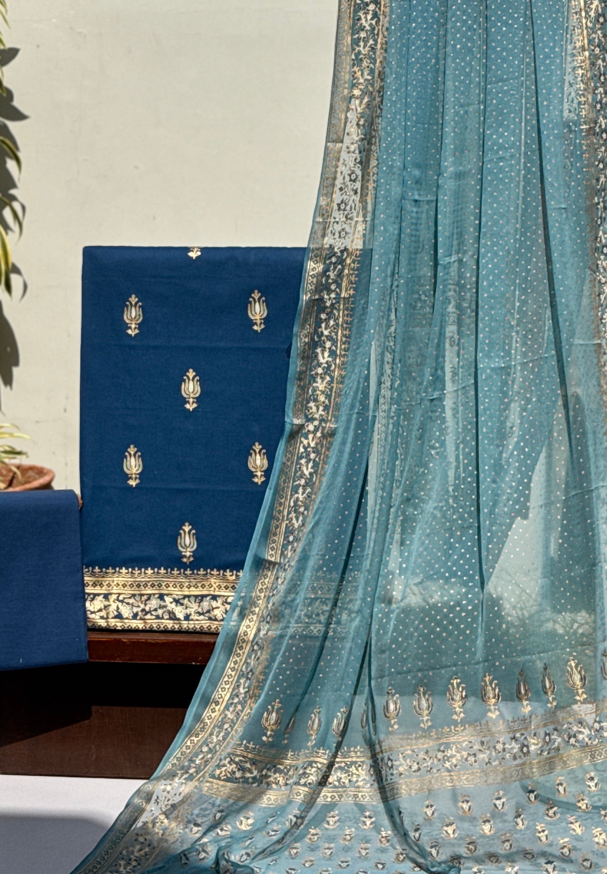 "Embrace timeless elegance with CLASSIC BLUE - a handcrafted ensemble of a 3 meter navy blue block printed shirt, 2.5 meter matching pants, and a 2.75 meter blue block printed dupatta. Perfect for any occasion, this sophisticated set exudes luxury and style."