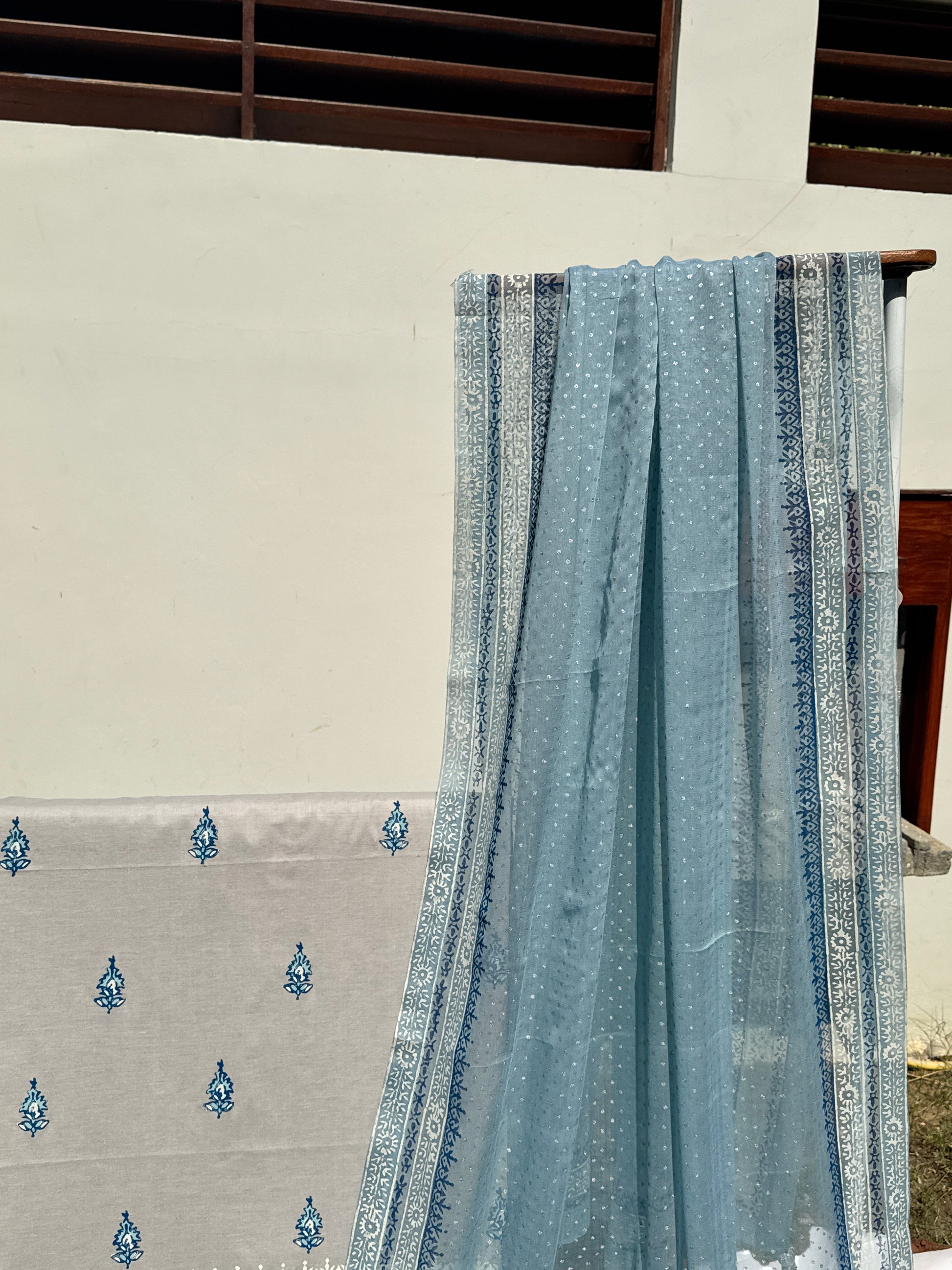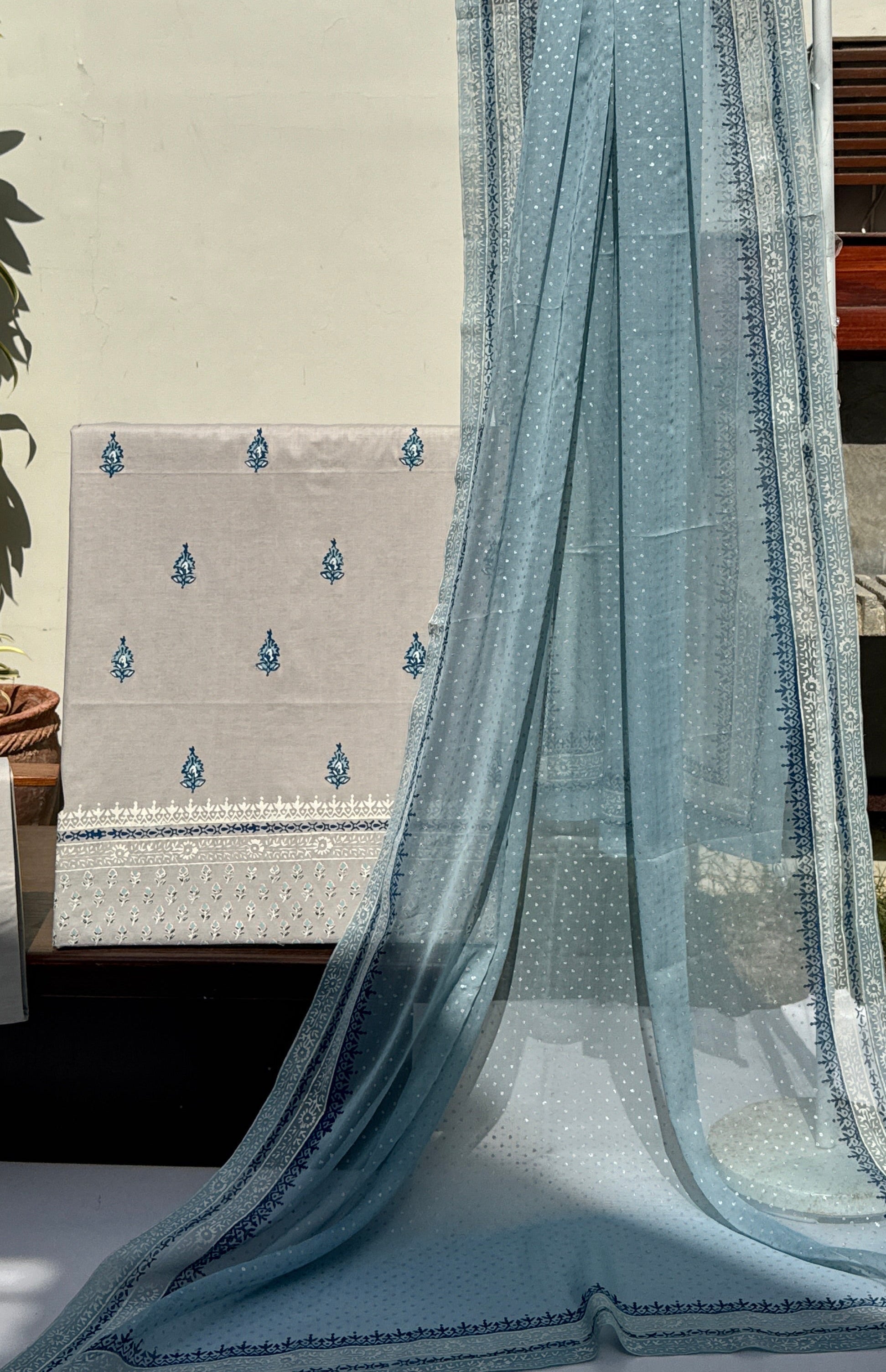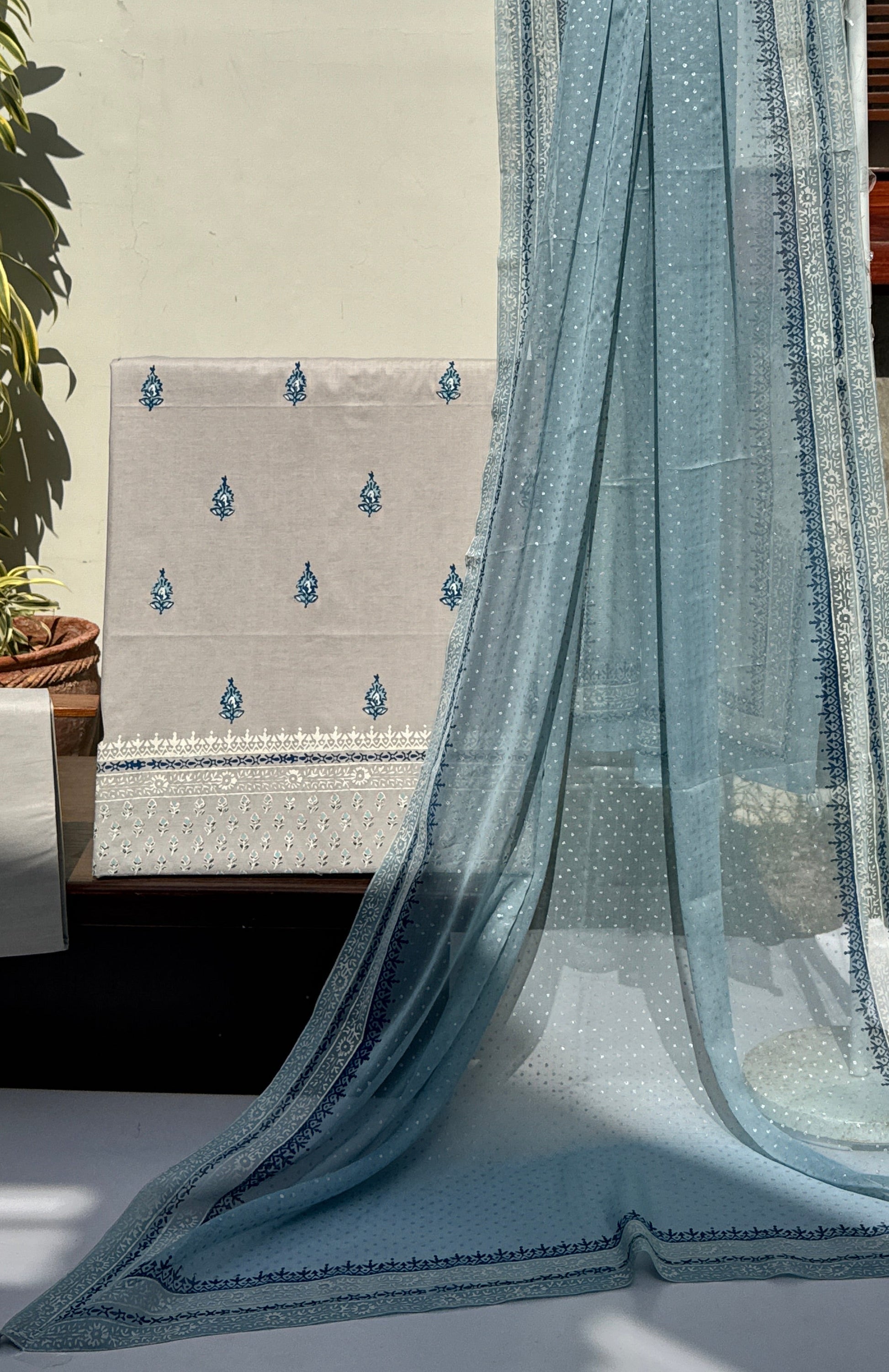 - Discover the depth of elegance with DIVE. This luxurious set features a 3 meters block printed grey cotton shirt, 2.5 meters matching pants, and a 2.75 meters block printed chiffon dupatta. Made with premium materials and exquisite craftsmanship, this ensemble is the perfect addition to your sophisticated wardrobe.