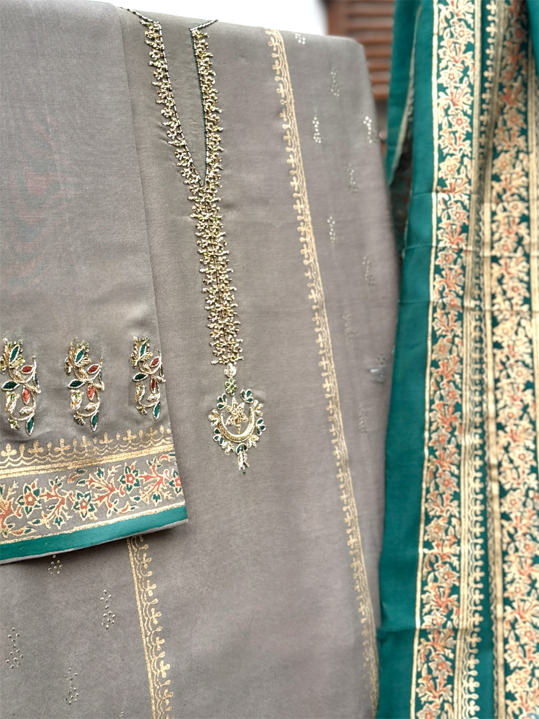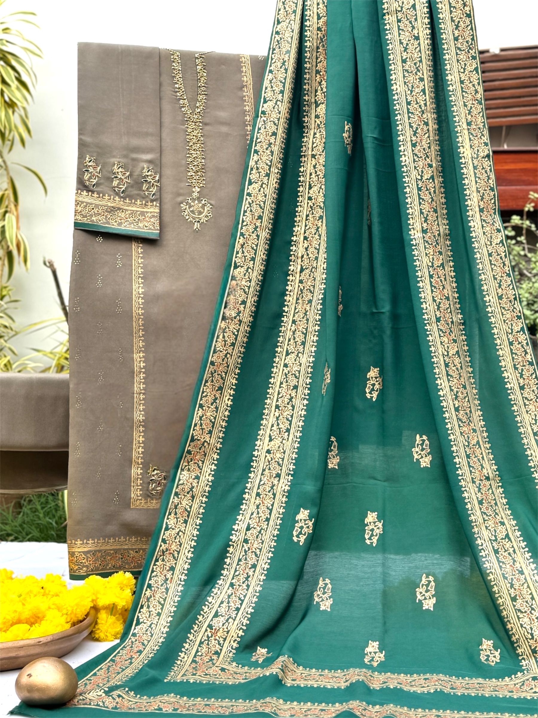 Emerald Grace, a stunning Khaddi silk suit that epitomizes refined elegance. The olive-toned shirt features exquisite hand-embroidered detailing along the neckline and sleeves, with intricate kamdaani work adorning the side panels and daaman. Complemented by a captivating emerald green block-printed dupatta, this sophisticated piece seamlessly blends traditional craftsmanship with contemporary design. Perfect for those who appreciate timeless luxury and artisanal excellence.