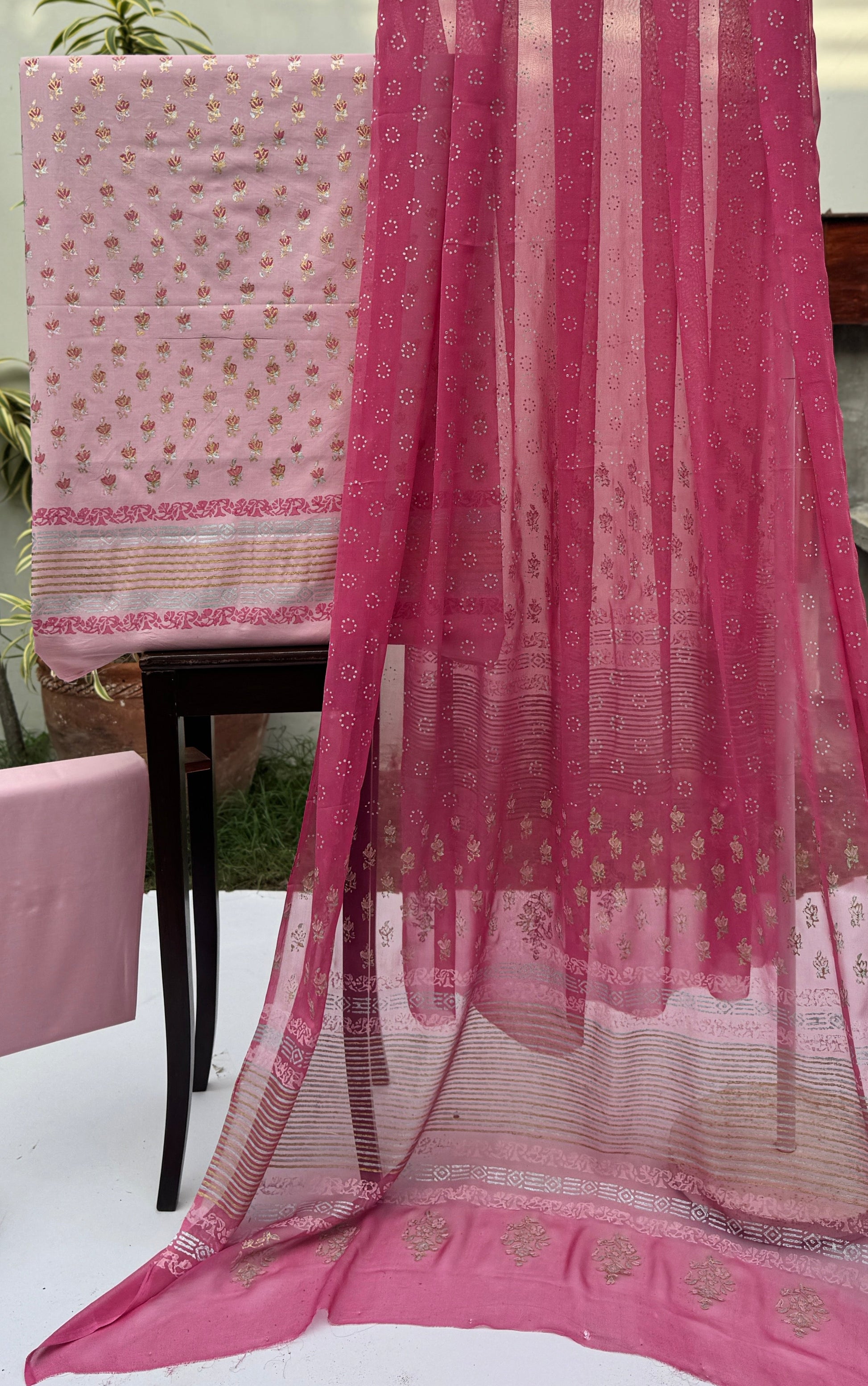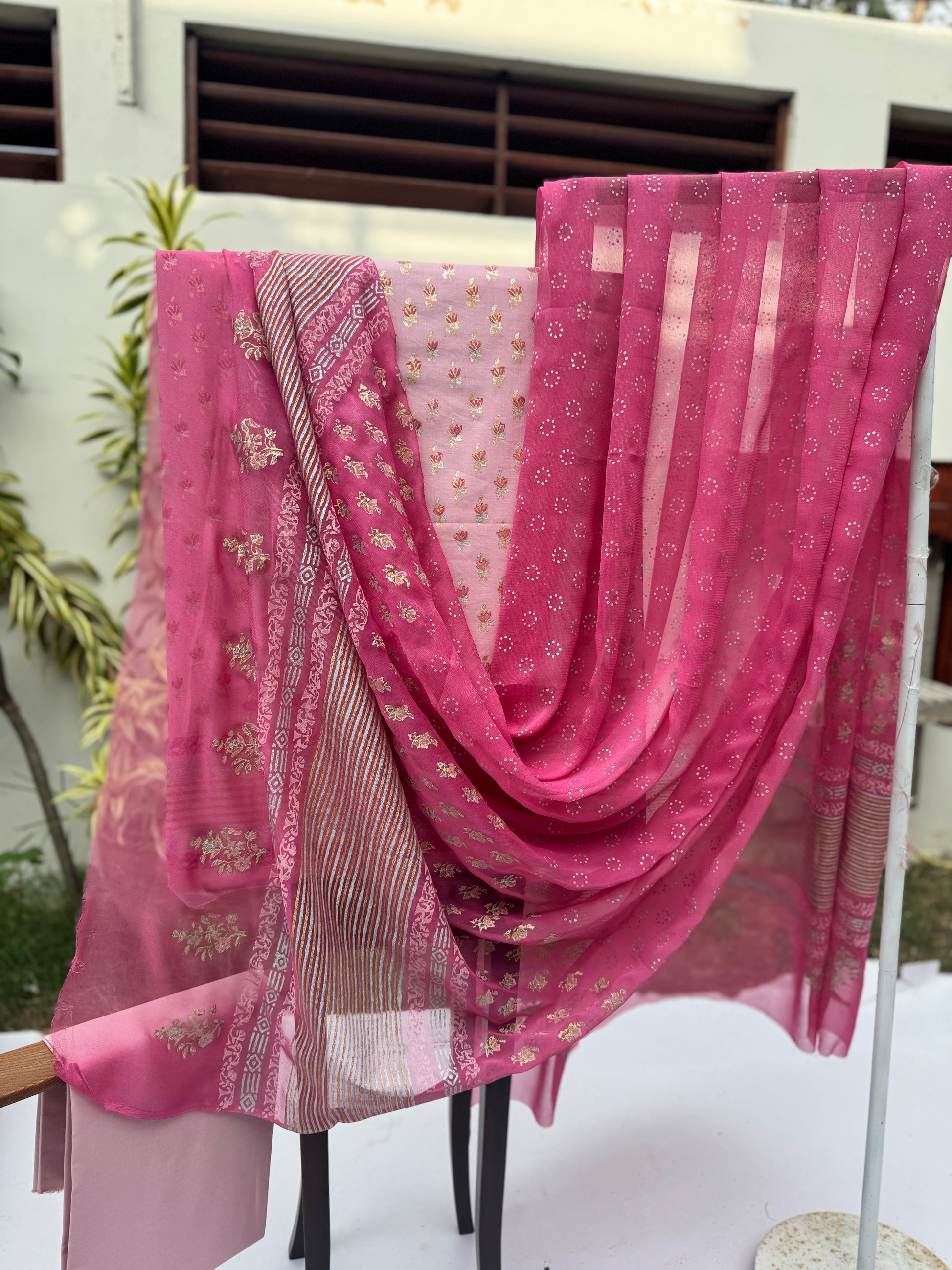 Indulge in luxury with FLAMINGO, a 3-piece block printed ensemble. Featuring a 3m pink cotton shirt, 2.5m pants, and a 2.75m chiffon dupatta, this set exudes sophistication and exclusivity. With delicate block prints and premium fabrics, it's the perfect addition to your wardrobe.