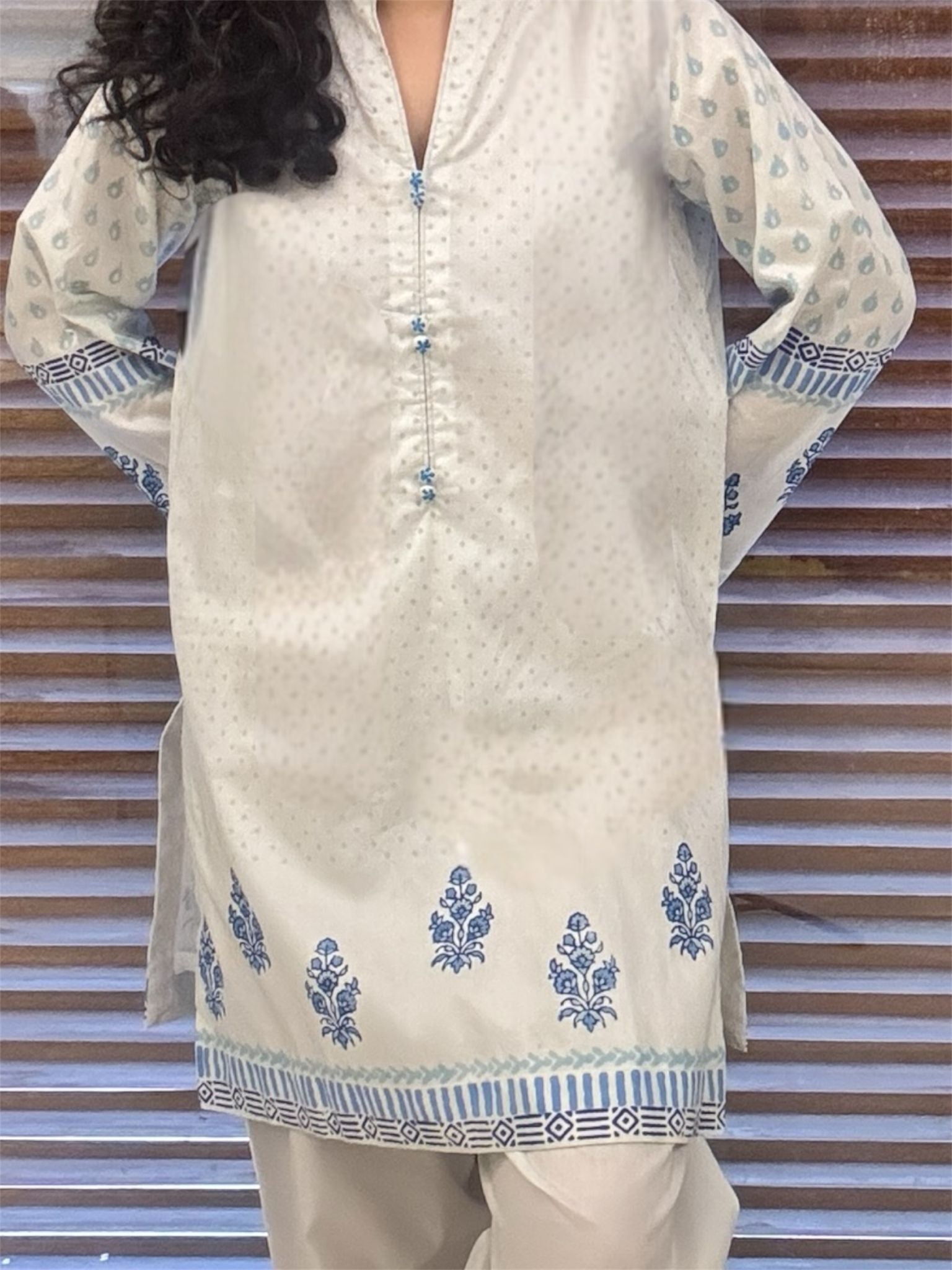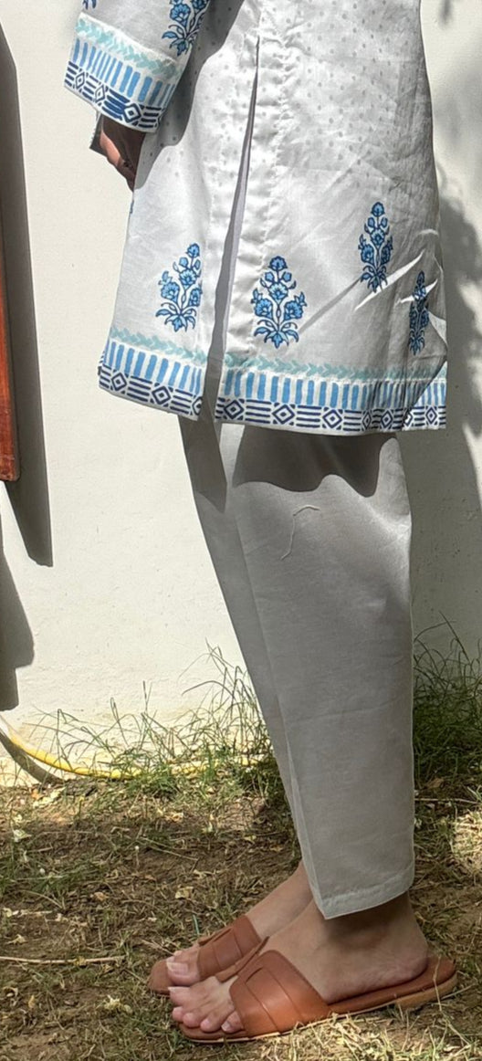 Elevate your wardrobe with this sophisticated cotton kurta featuring exquisite block printing and elegant button detailing along the neckline. Paired with a slim-fit shalwar, this ensemble combines traditional craftsmanship with a modern silhouette for a refined, graceful look. Perfect for occasions where understated elegance is key.