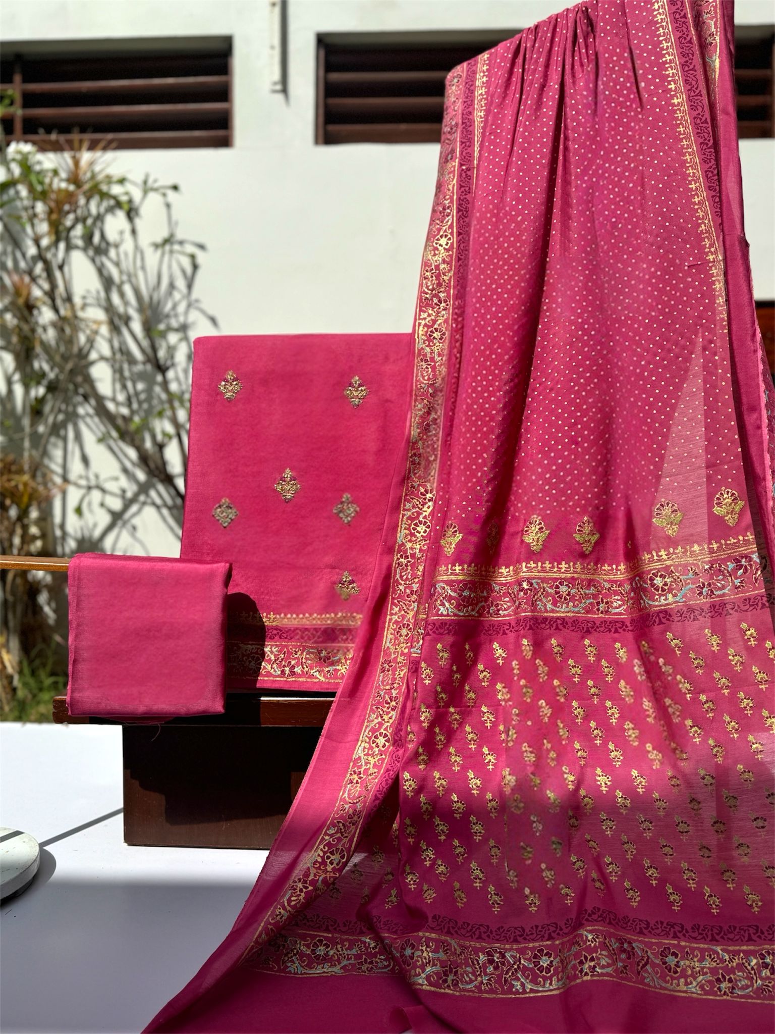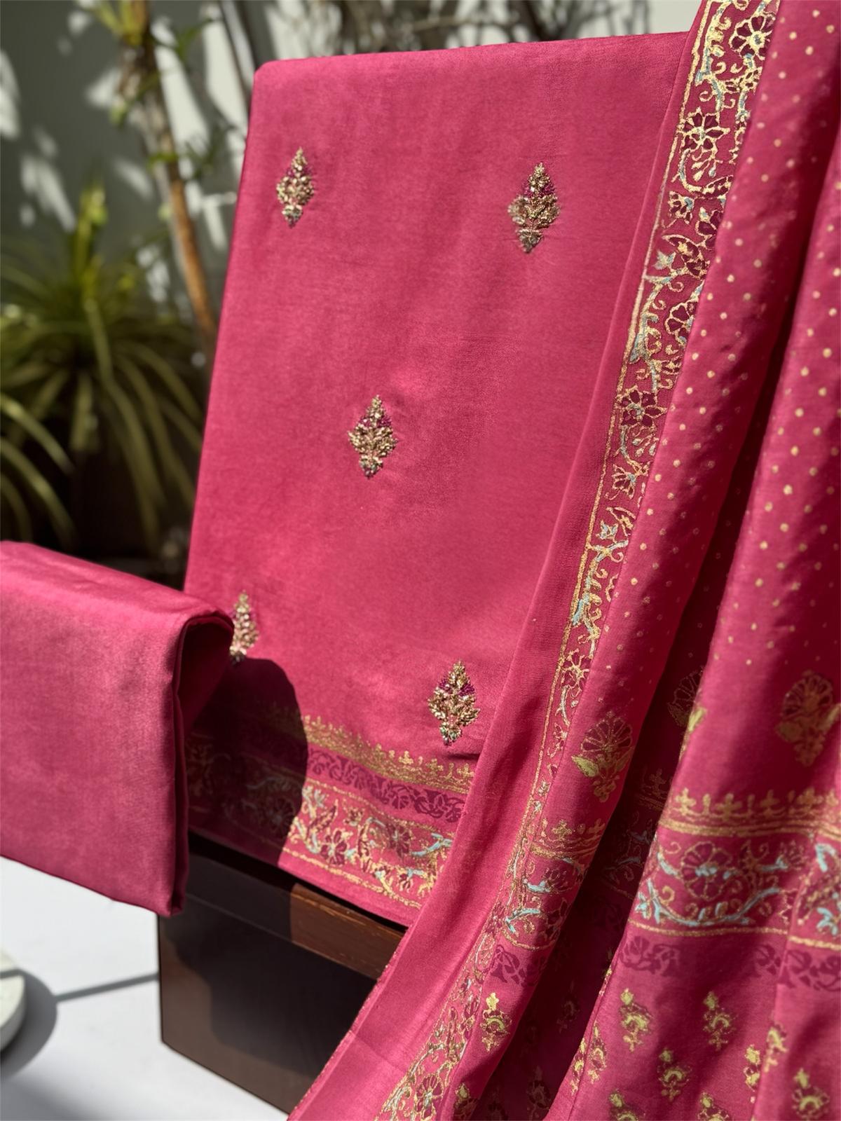Discover the elegance of GULNAAR, featuring a hand-embroidered Khaddi silk shirt adorned with delicate block prints on the back and sleeves. Paired with plain viscose silk pants, this ensemble offers a graceful silhouette. Complete the look with a block-printed Khaddi silk dupatta, adding a touch of refined artistry in 2.75 yards of luxurious fabric. Perfect for those who appreciate sophisticated craftsmanship and timeless style.