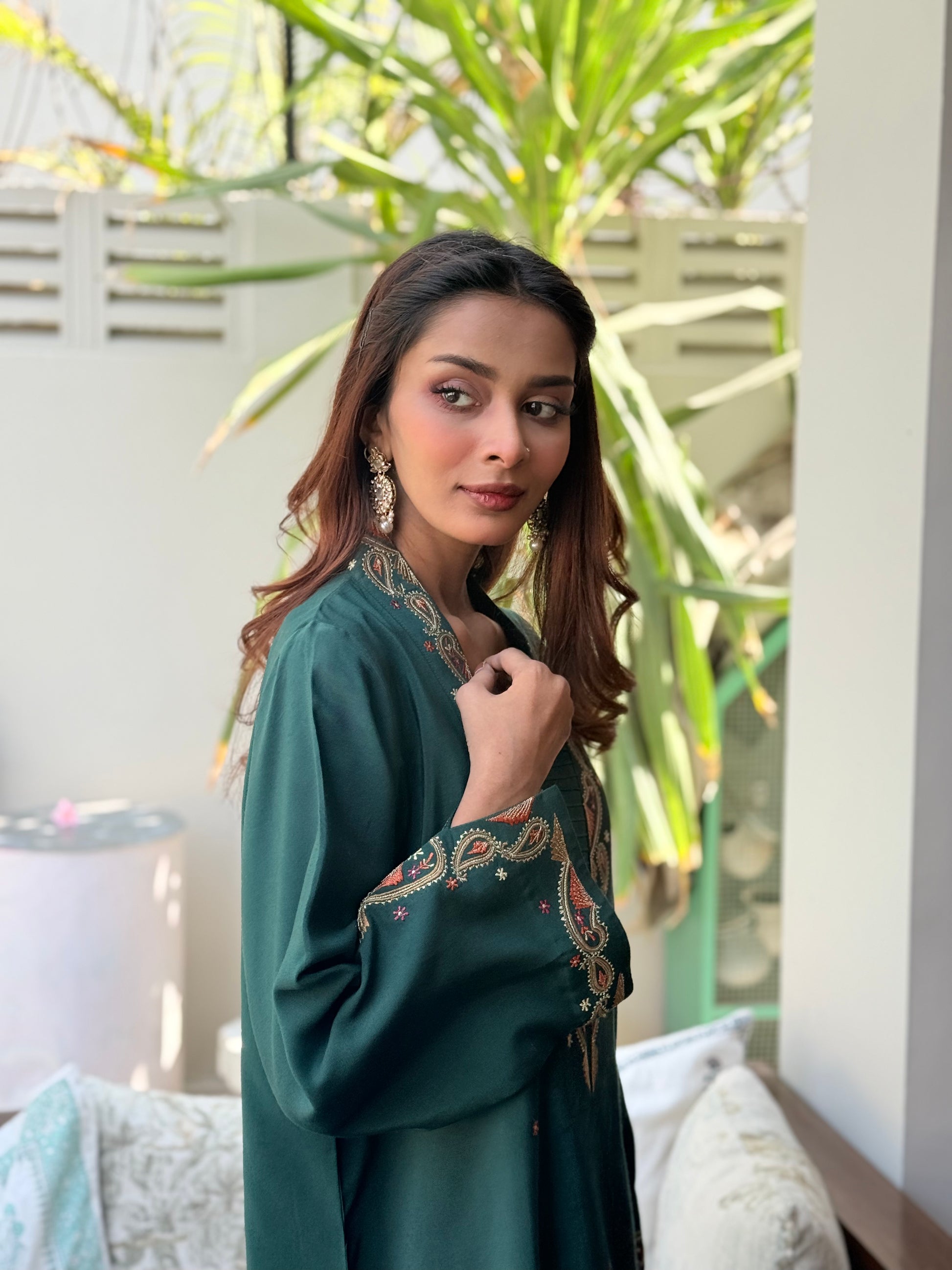 Elevate your wardrobe with this exquisite two-piece ensemble in rich emerald tones. Meticulously stitched and adorned with intricate embroidery, each piece showcases refined craftsmanship and timeless elegance. The sophisticated design seamlessly blends traditional artistry with contemporary style, making it an ideal choice for those who appreciate quality and understated luxury. Perfect for special occasions or elevated everyday wear.