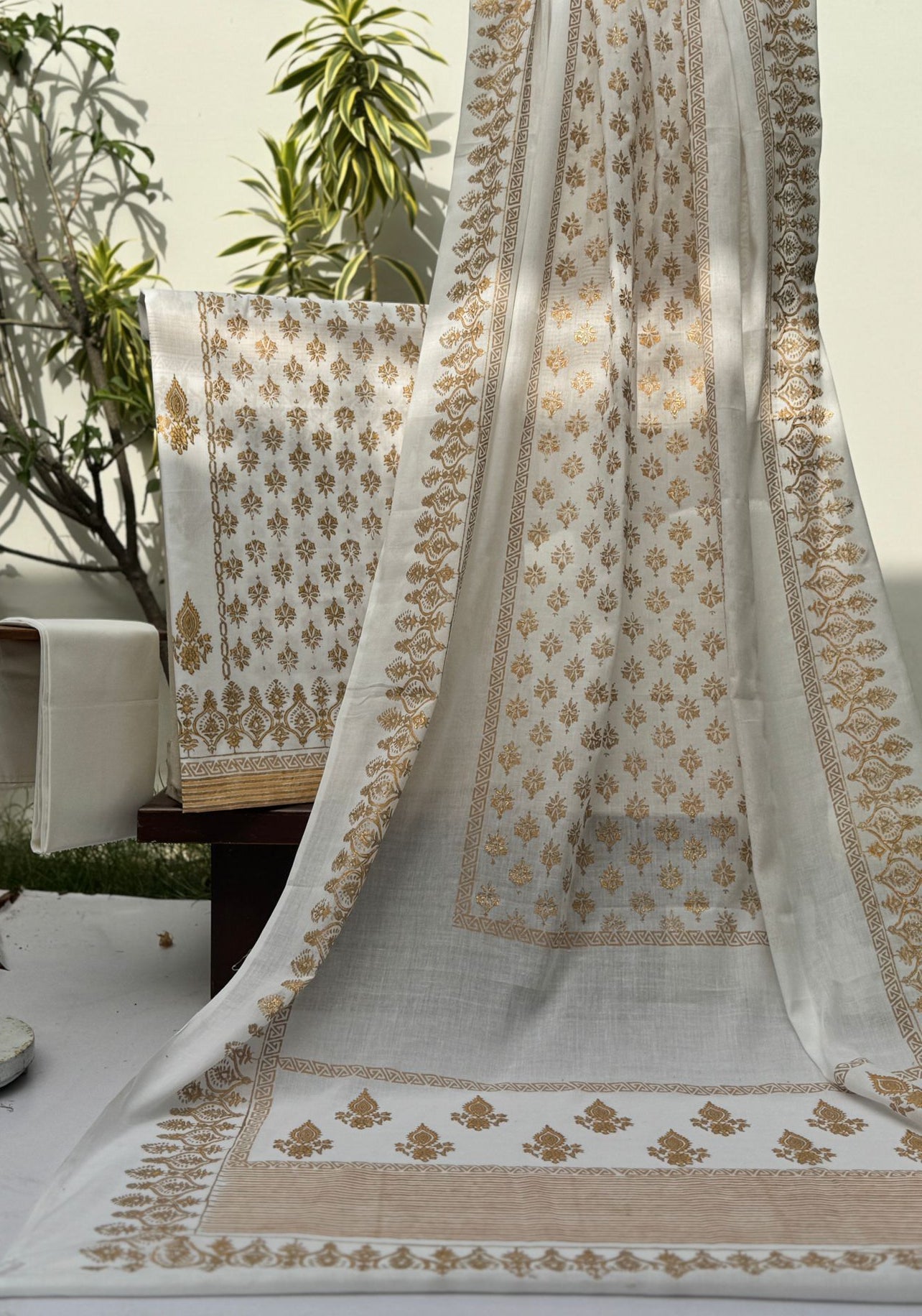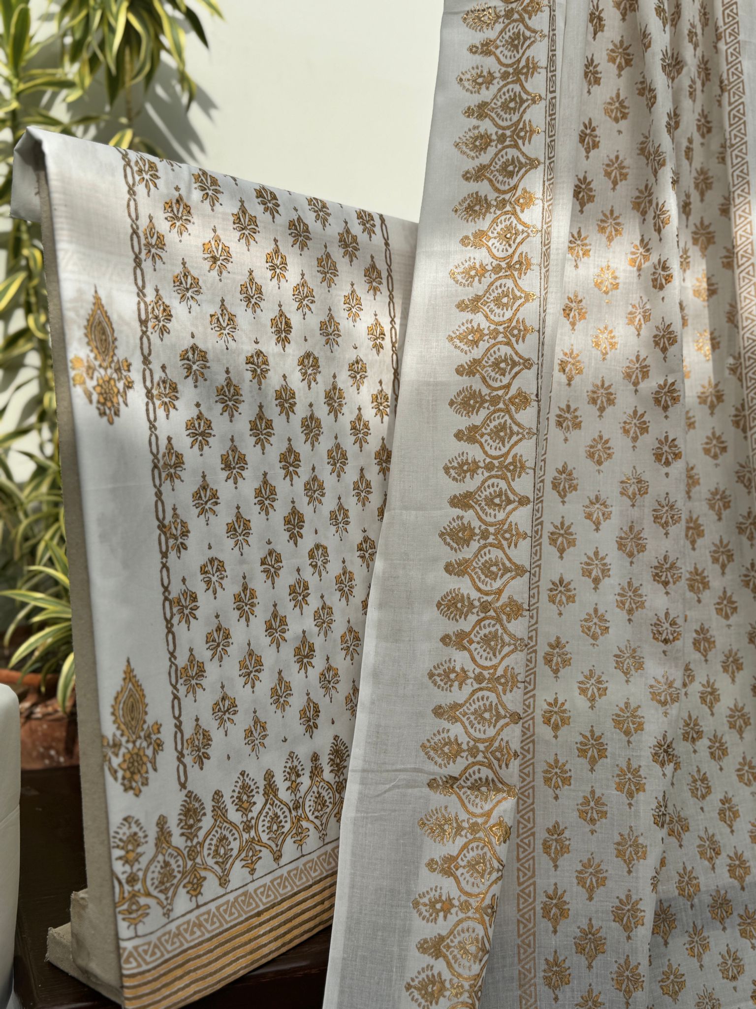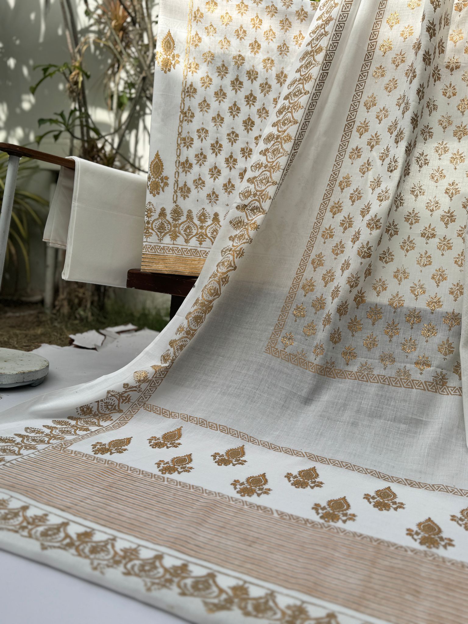 Experience elegant comfort with the Jasmine set, featuring a 3-piece unstitched outfit crafted for refinement. It includes a 3-yard blockprinted lawn shirt, 2.5 yards of plain lawn fabric for tailored pants, and a 2.75-yard blockprinted lawn dupatta. This combination offers versatility and graceful style, perfect for customized tailoring that suits your sophisticated taste.
