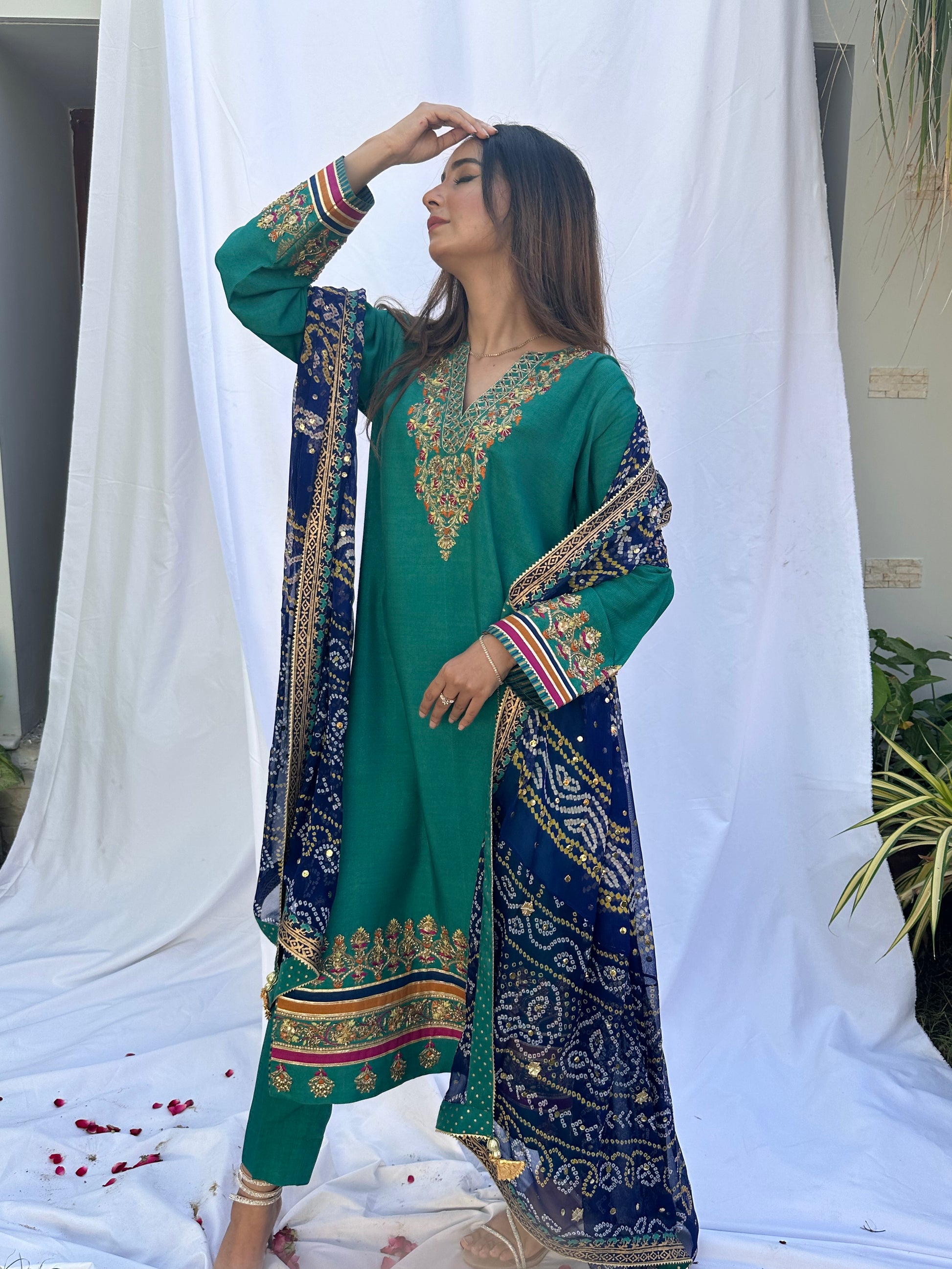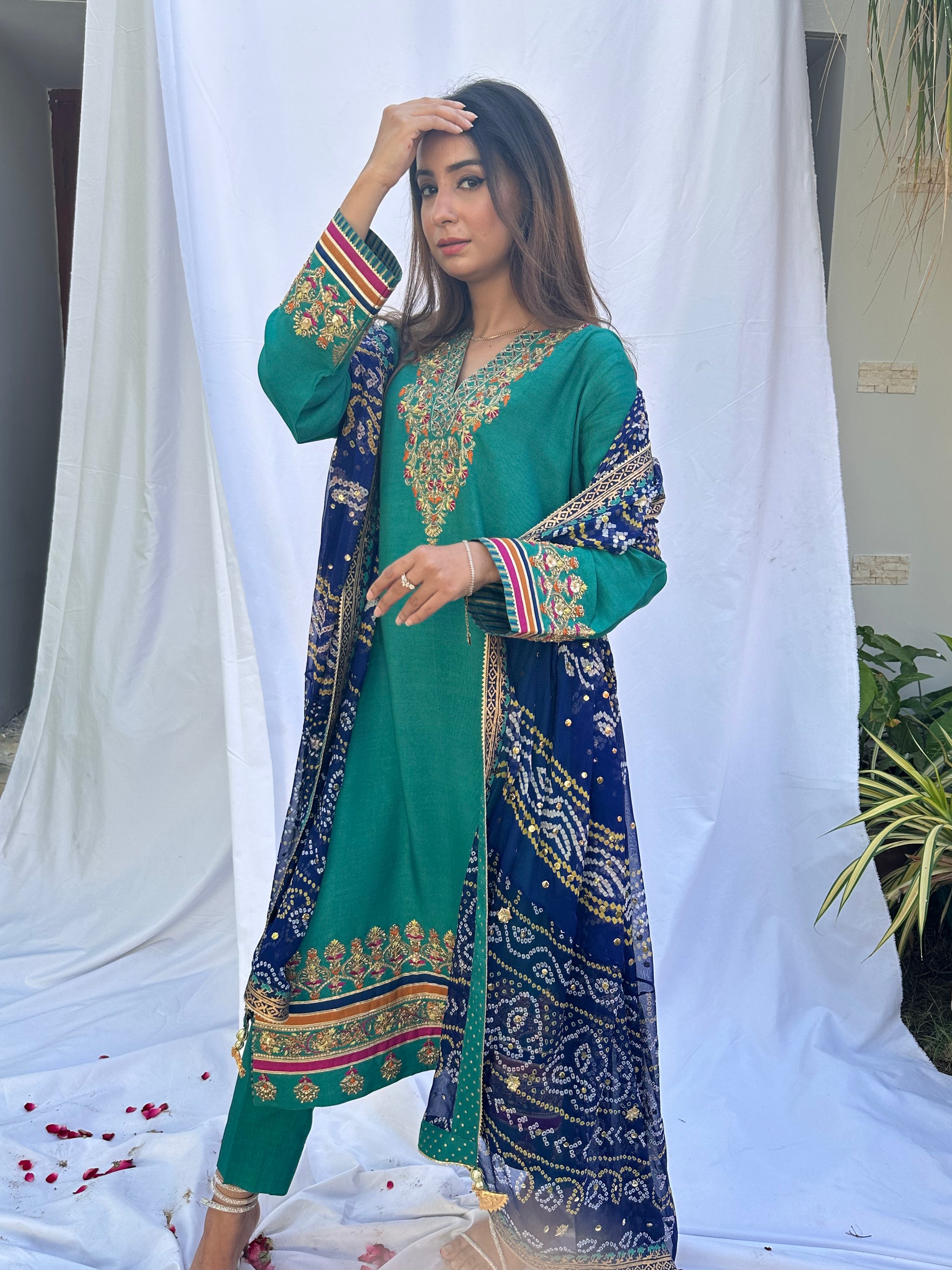 This elegant teal silk long shirt features exquisite block printing complemented by delicate hand embroidery, offering a refined look. Paired with a chunri dupatta adorned with matching block print and intricate kamdaani work, this ensemble blends traditional craftsmanship with timeless sophistication. Perfect for graceful occasions, it brings a subtle yet striking charm to your wardrobe.