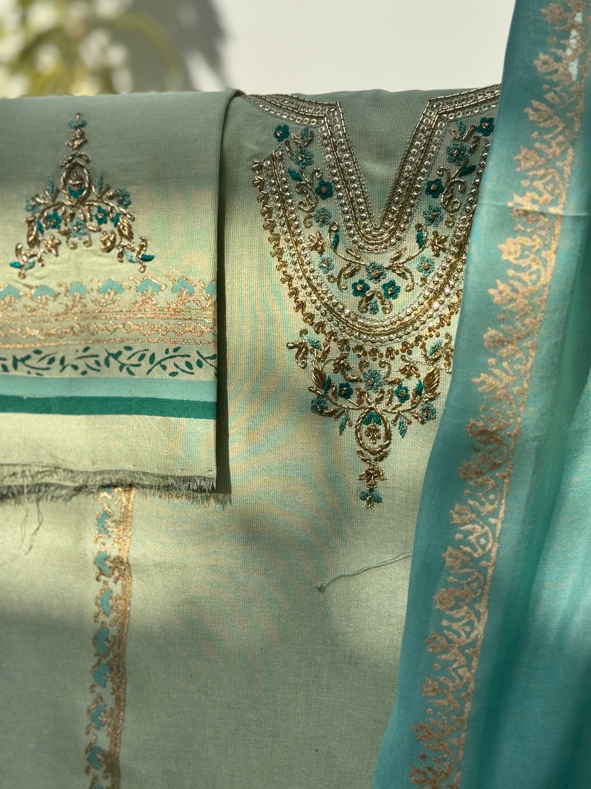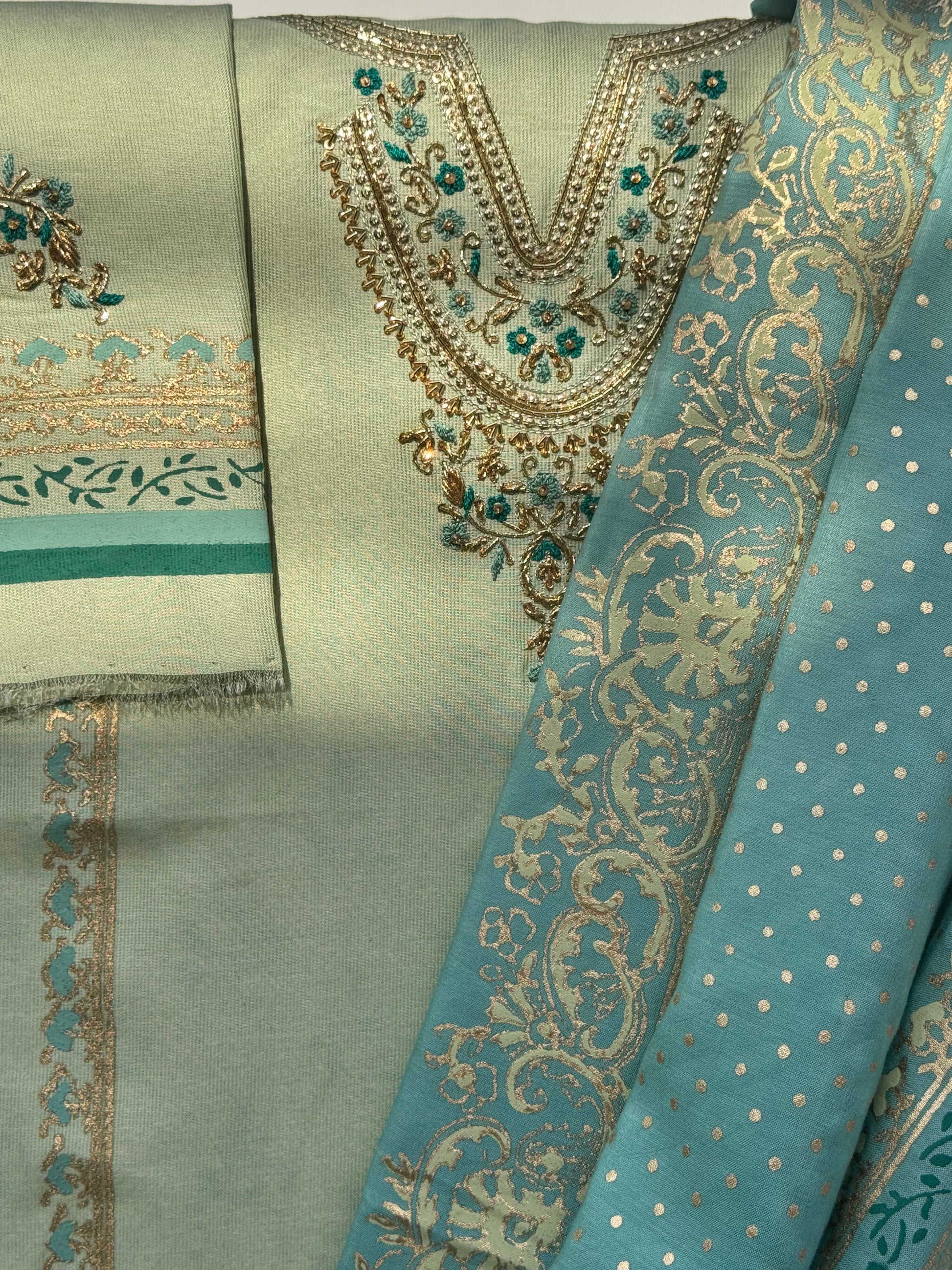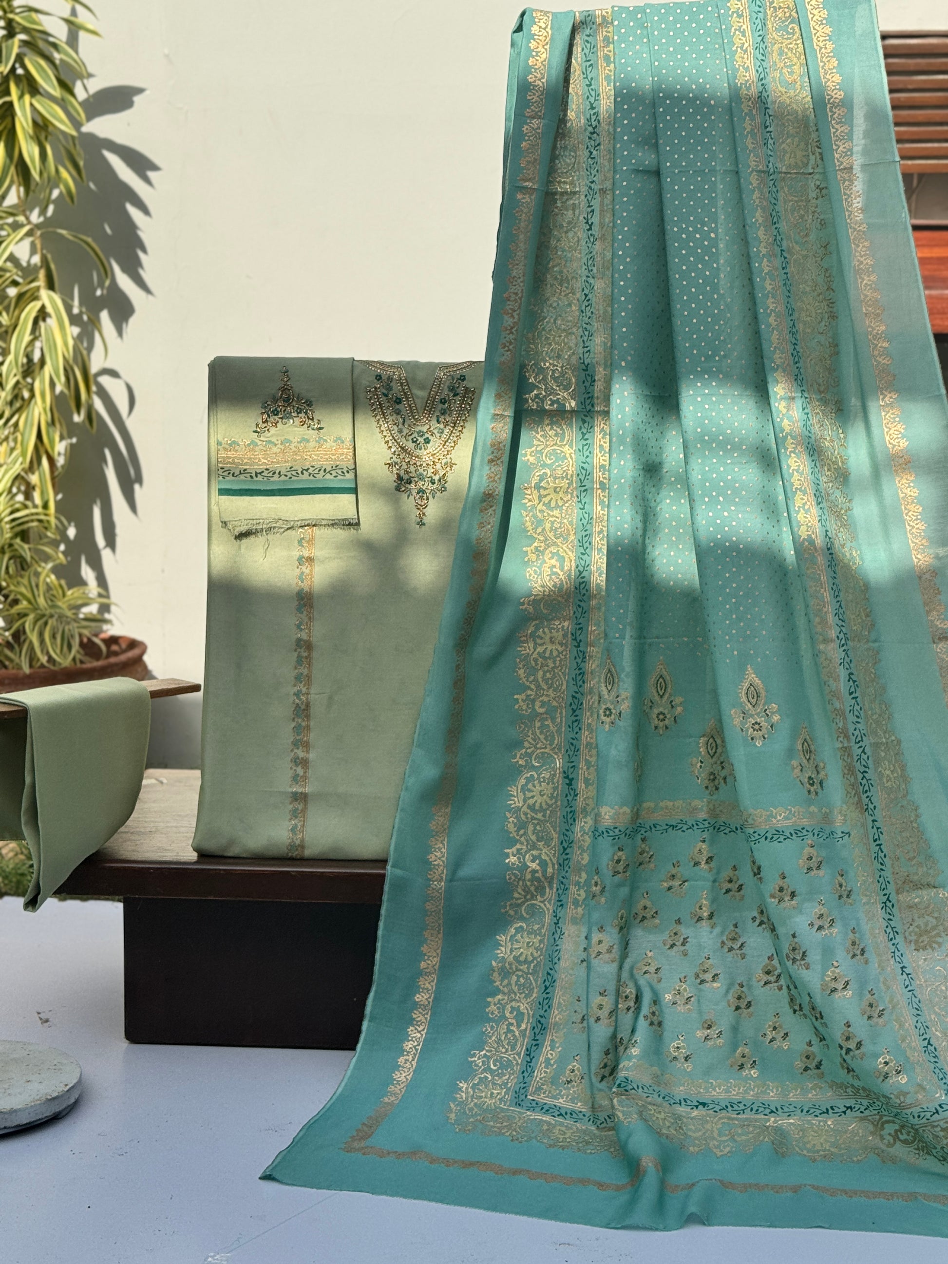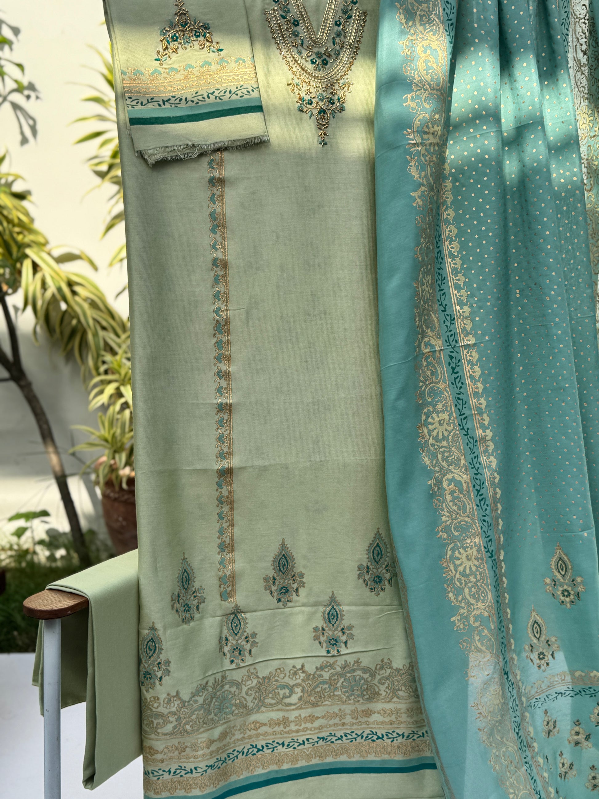 Indulge in luxury with PISTACHIO, a hand-embroidered and block-printed khaddi silk shirt, paired with khaddi silk pants and a block-printed dupatta. Made from high-quality materials, this ensemble exudes elegance and sophistication, making it perfect for any special occasion. Elevate your wardrobe with PISTACHIO.