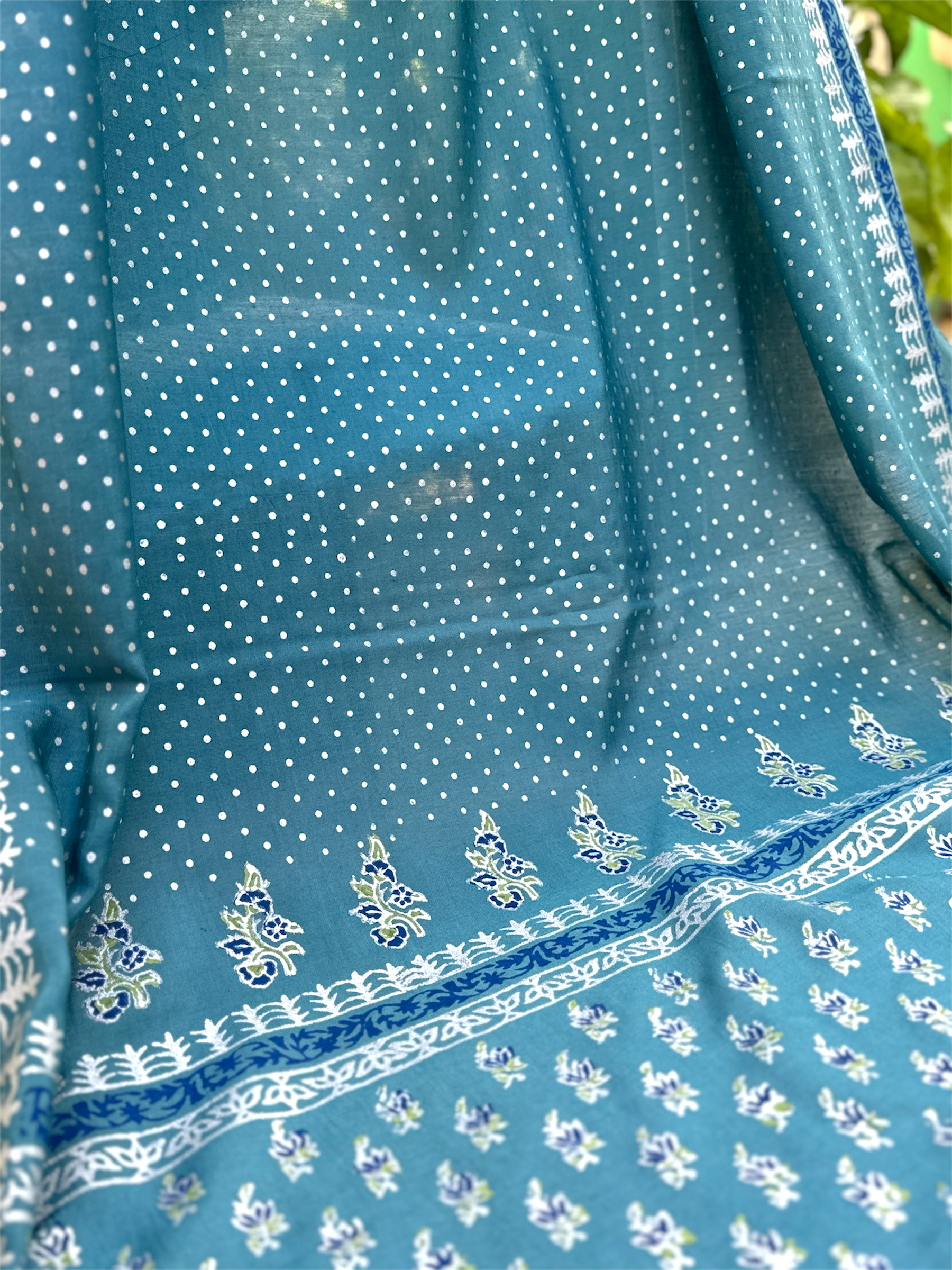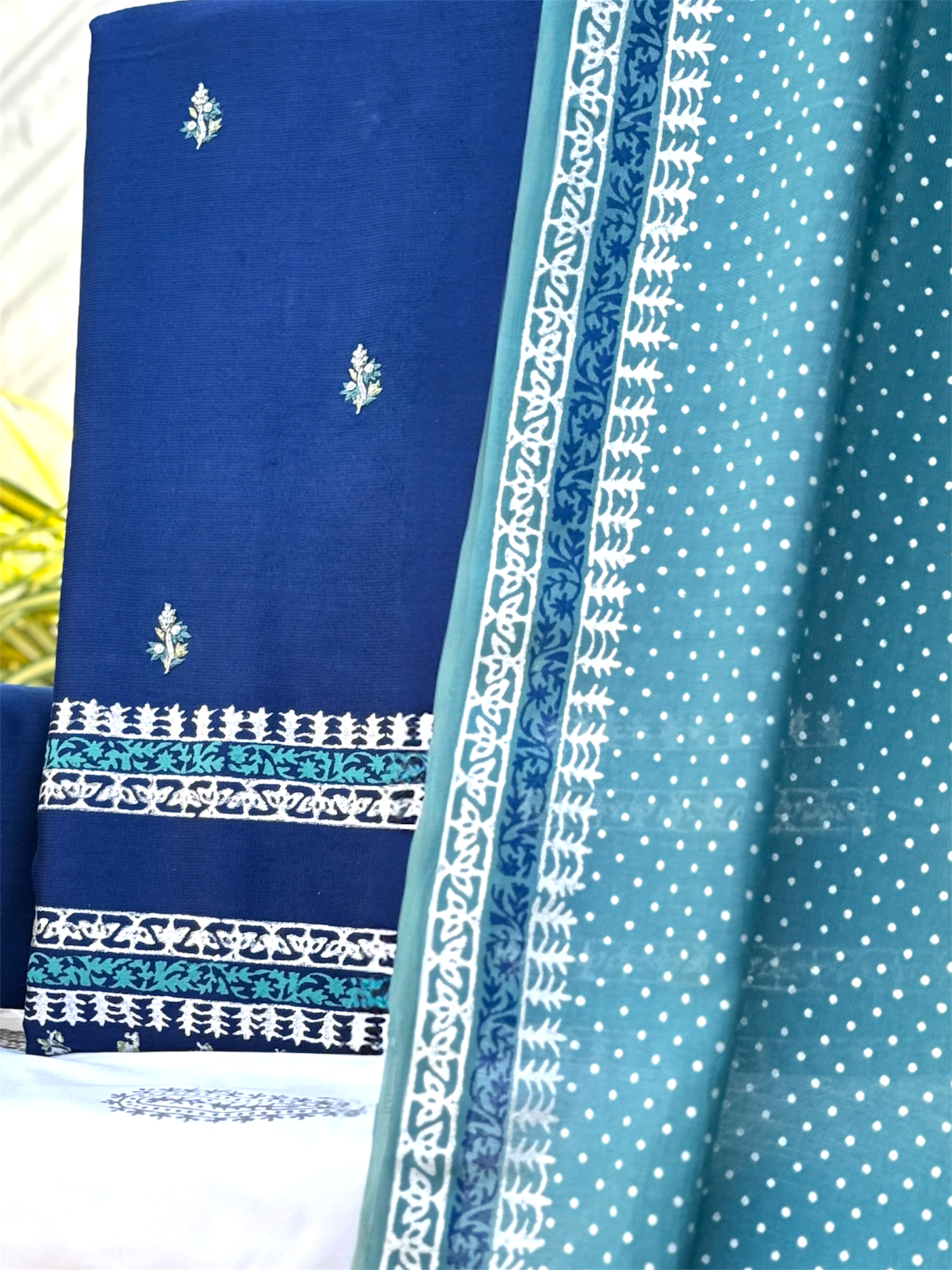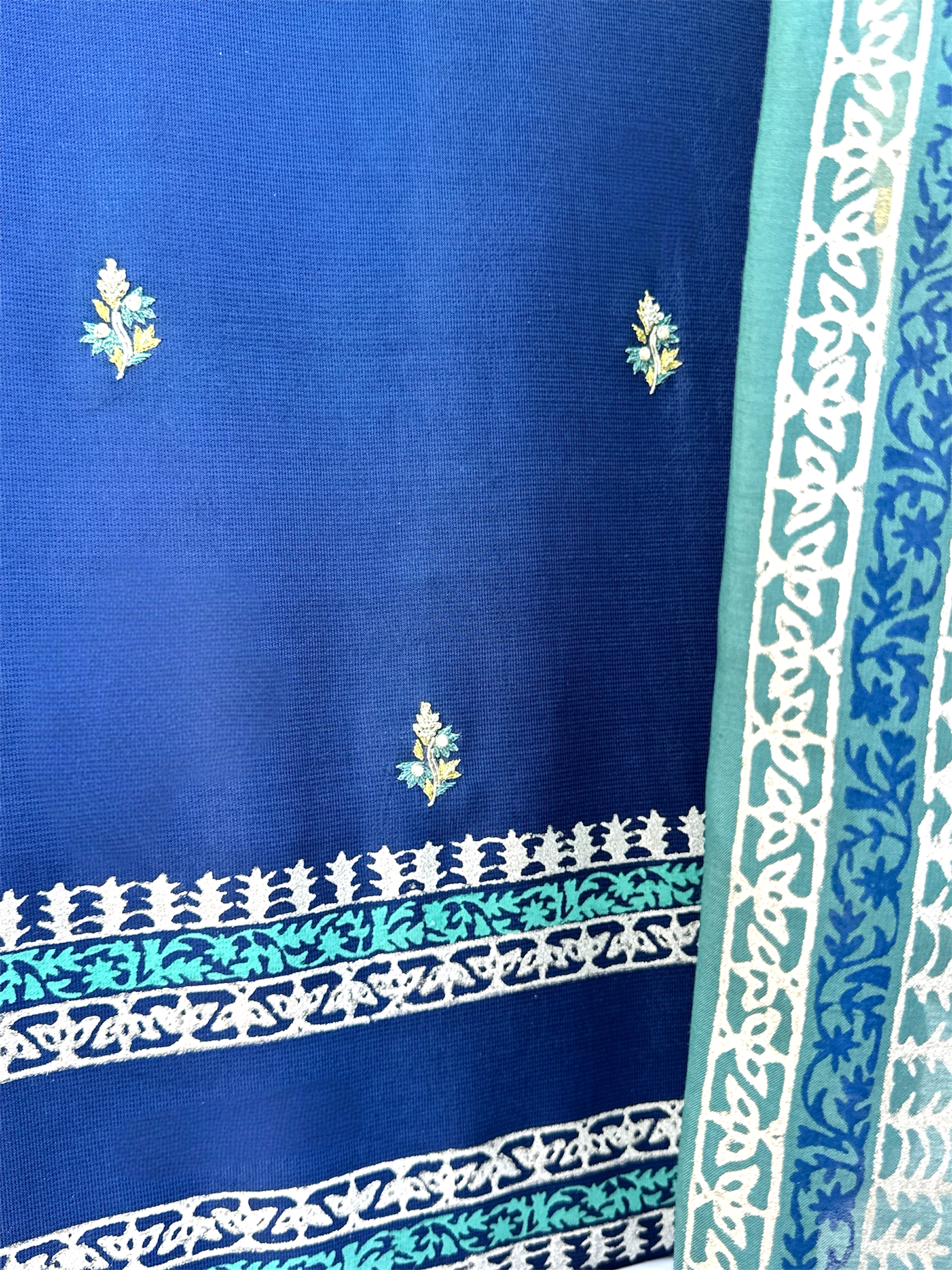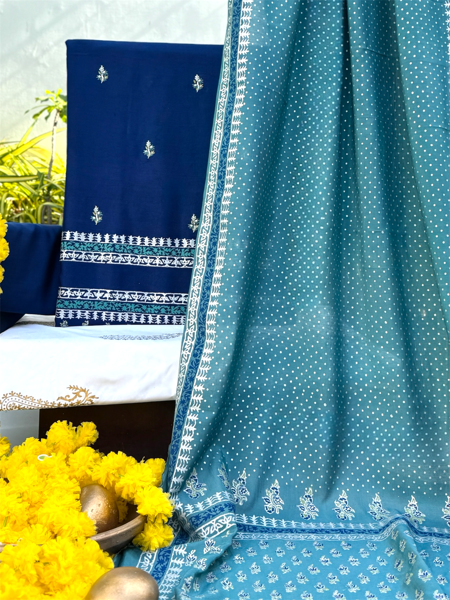 An elegant ensemble crafted from luxurious khaddi silk. This navy blue suit features meticulously hand-embroidered motifs adorning the front, while the back and sleeves showcase traditional block-print. Complementing the sophisticated silhouette is a striking turquoise block-printed dupatta., creating a refined and cohesive look that celebrates artisanal craftsmanship.