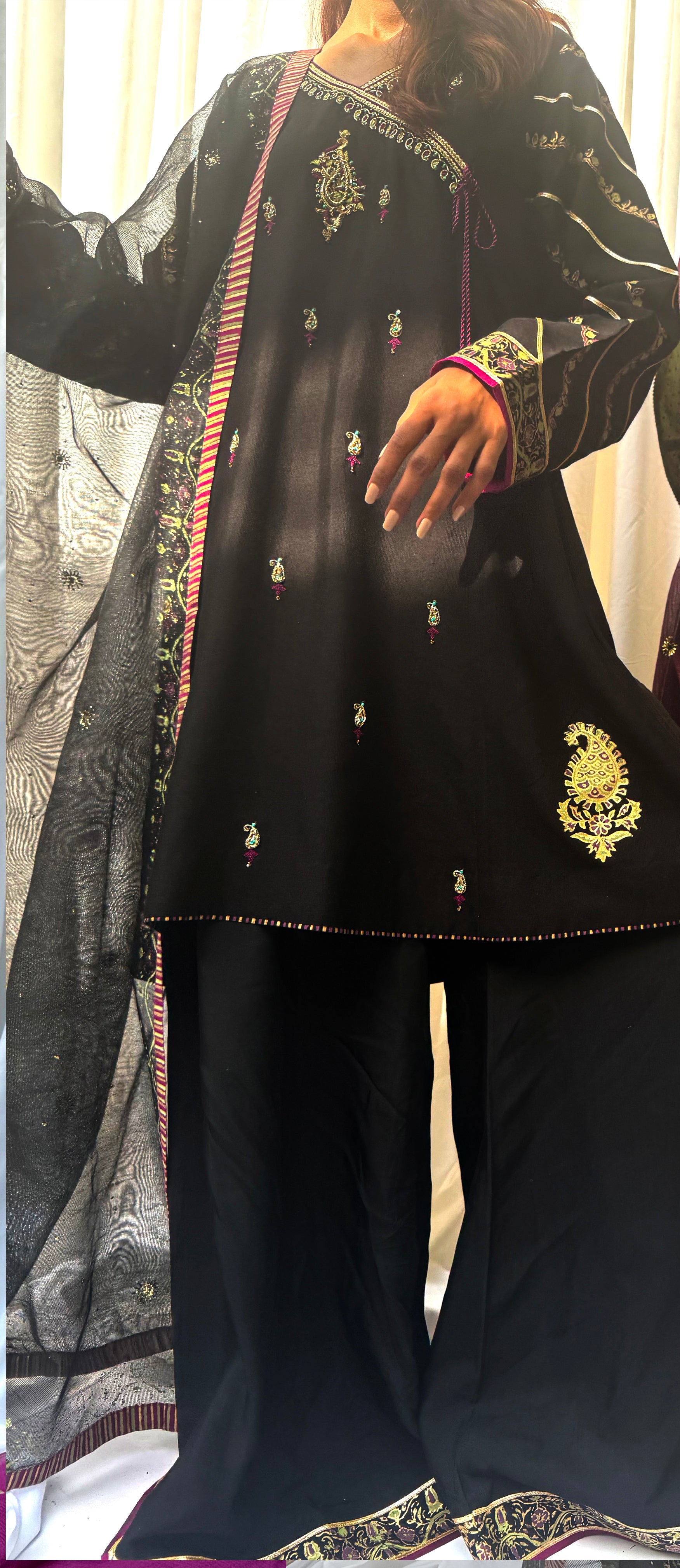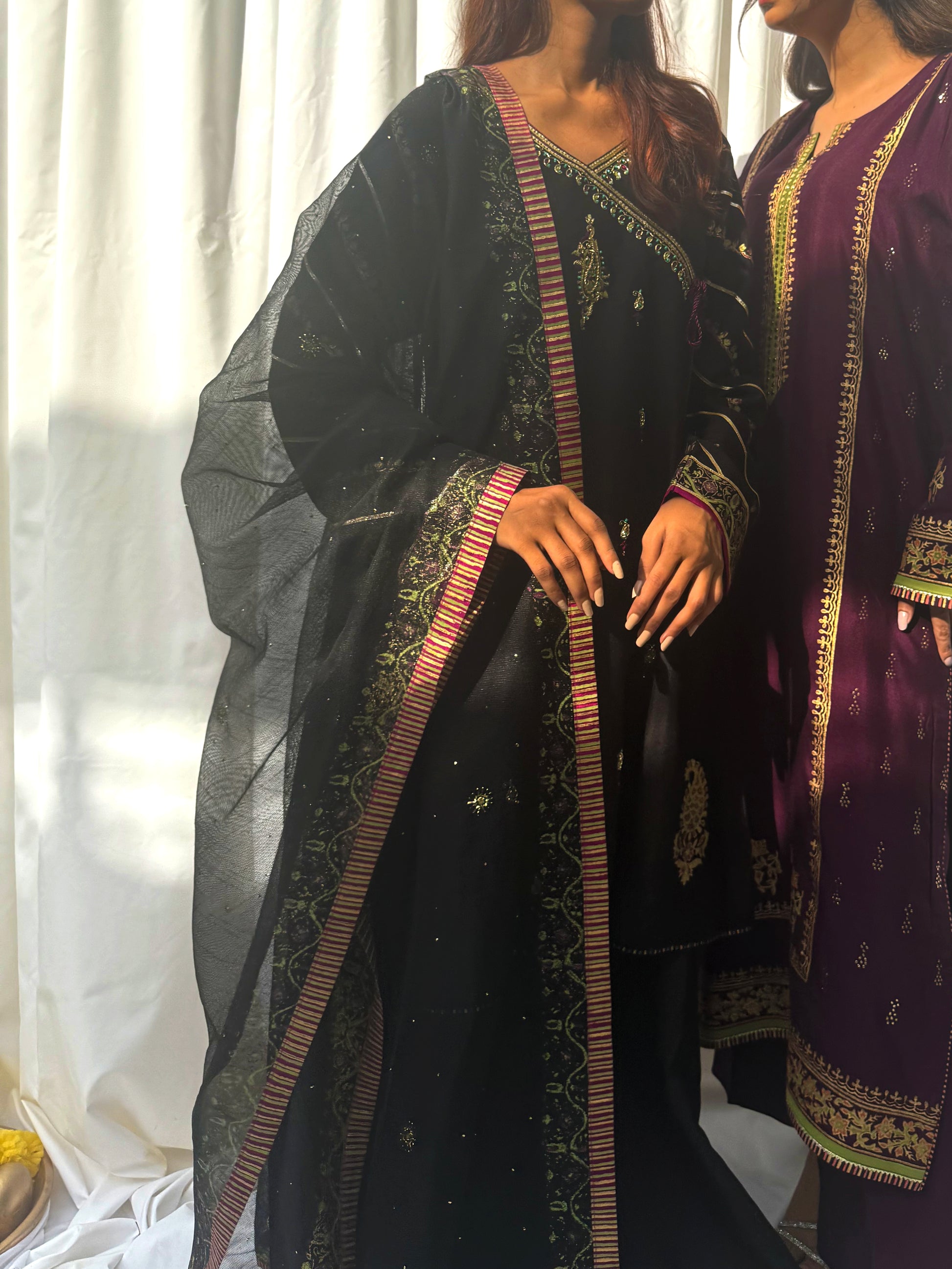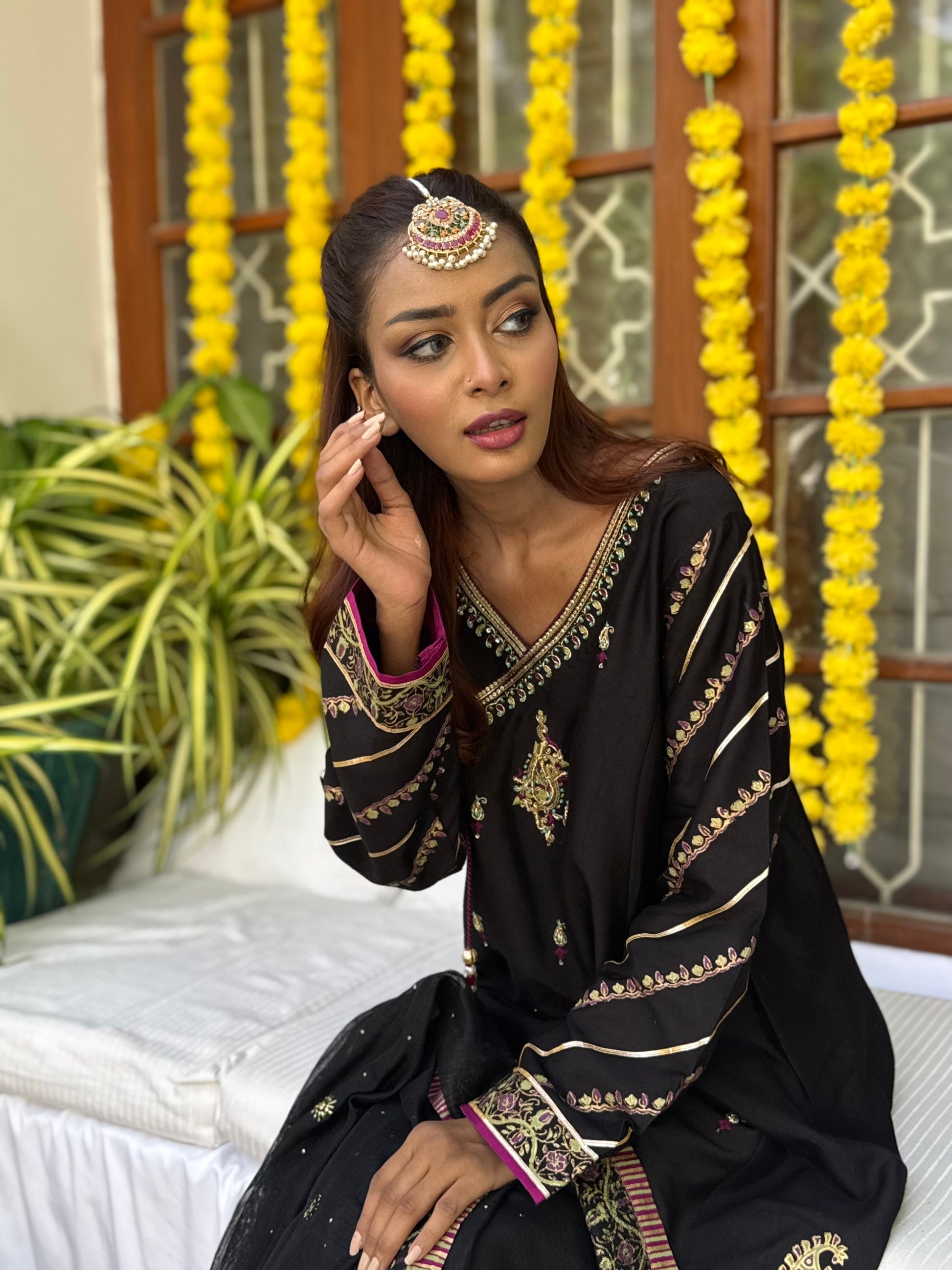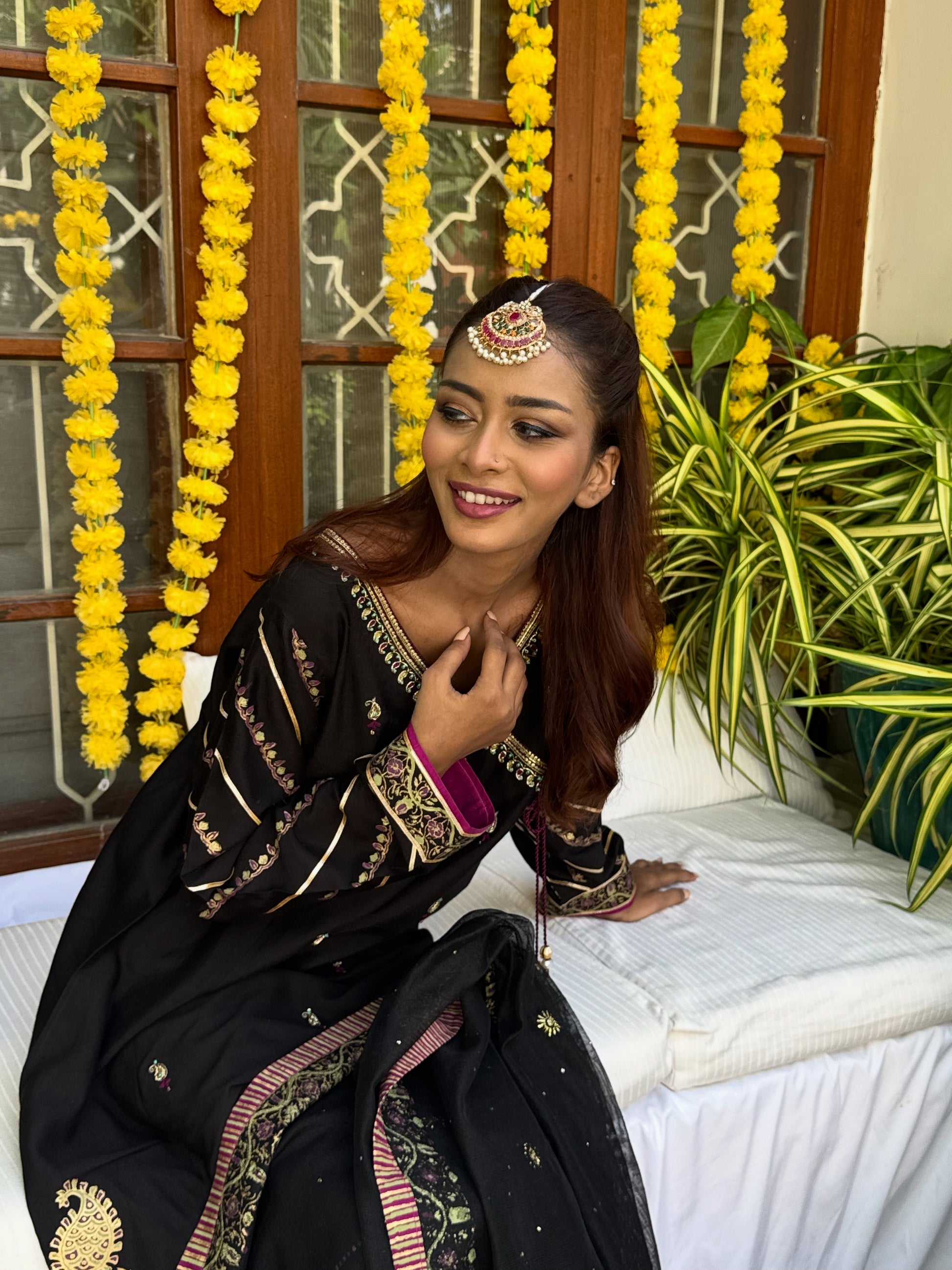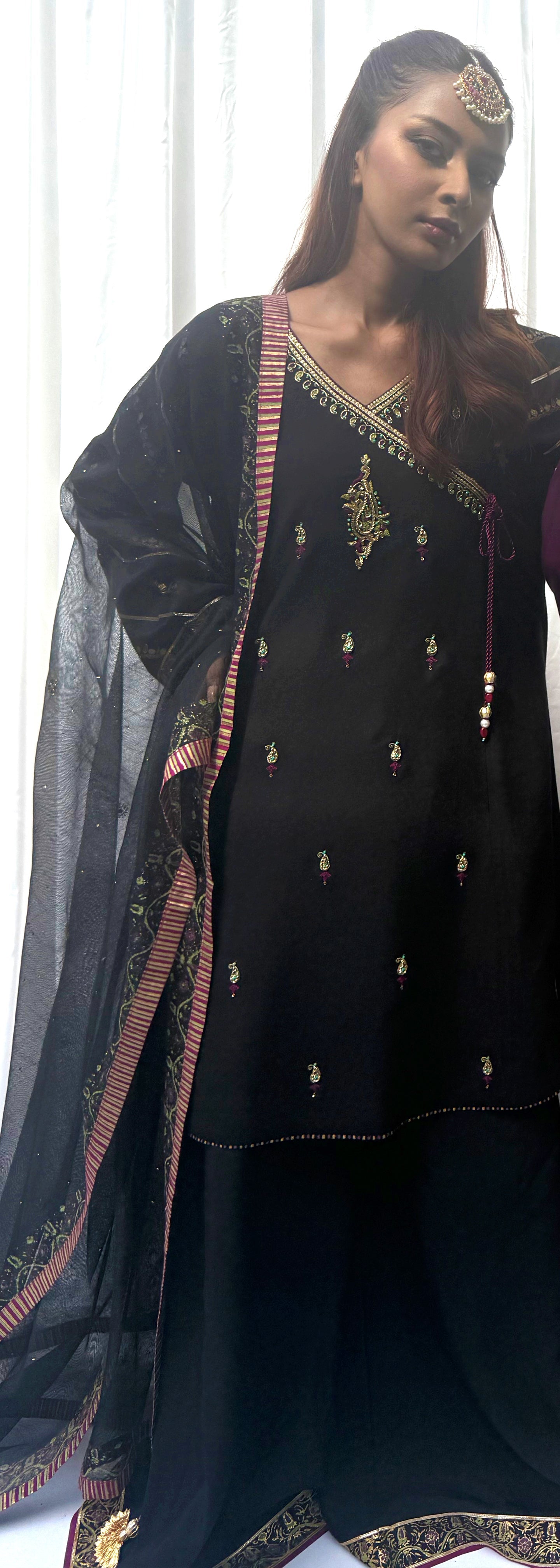 Experience elegance with SIAH, a refined khaddi silk angharka featuring intricate hand embroidery and delicate block print. Paired with classic dhaka pajama, this ensemble balances tradition and grace effortlessly. Complemented by a beautiful dupatta adorned with block print and subtle kamdani work, it completes a sophisticated look perfect for fun festive occasions.