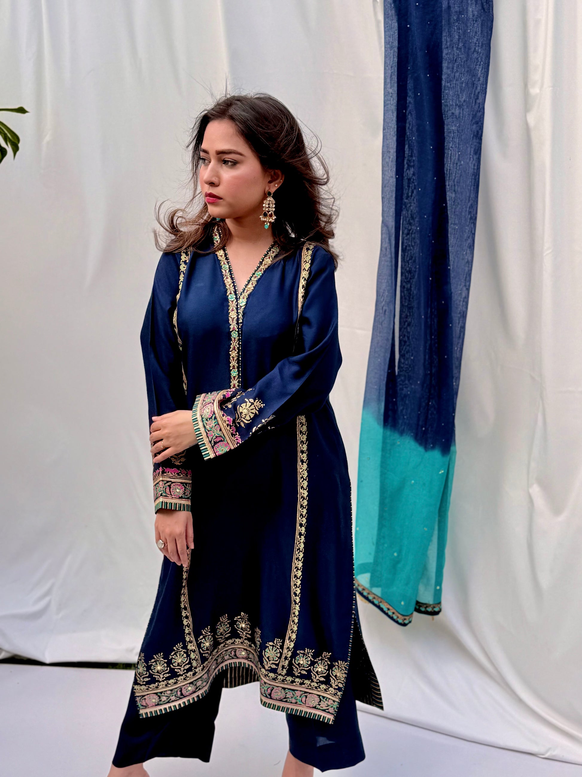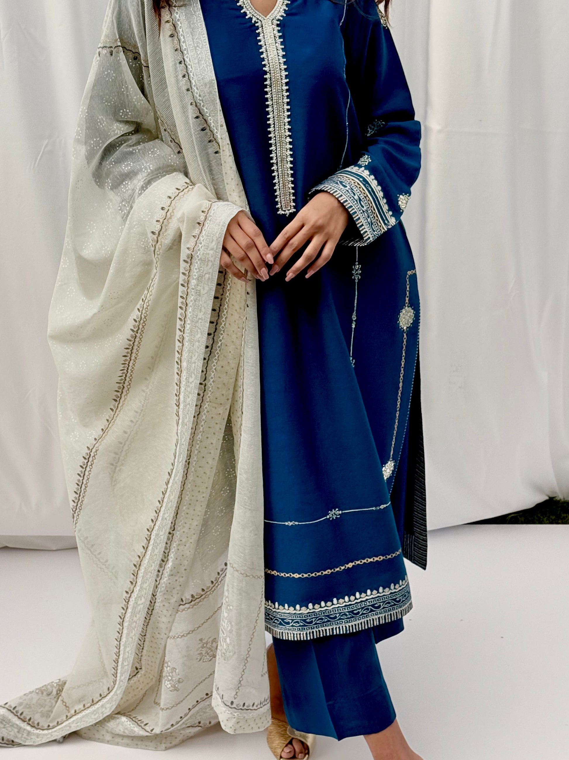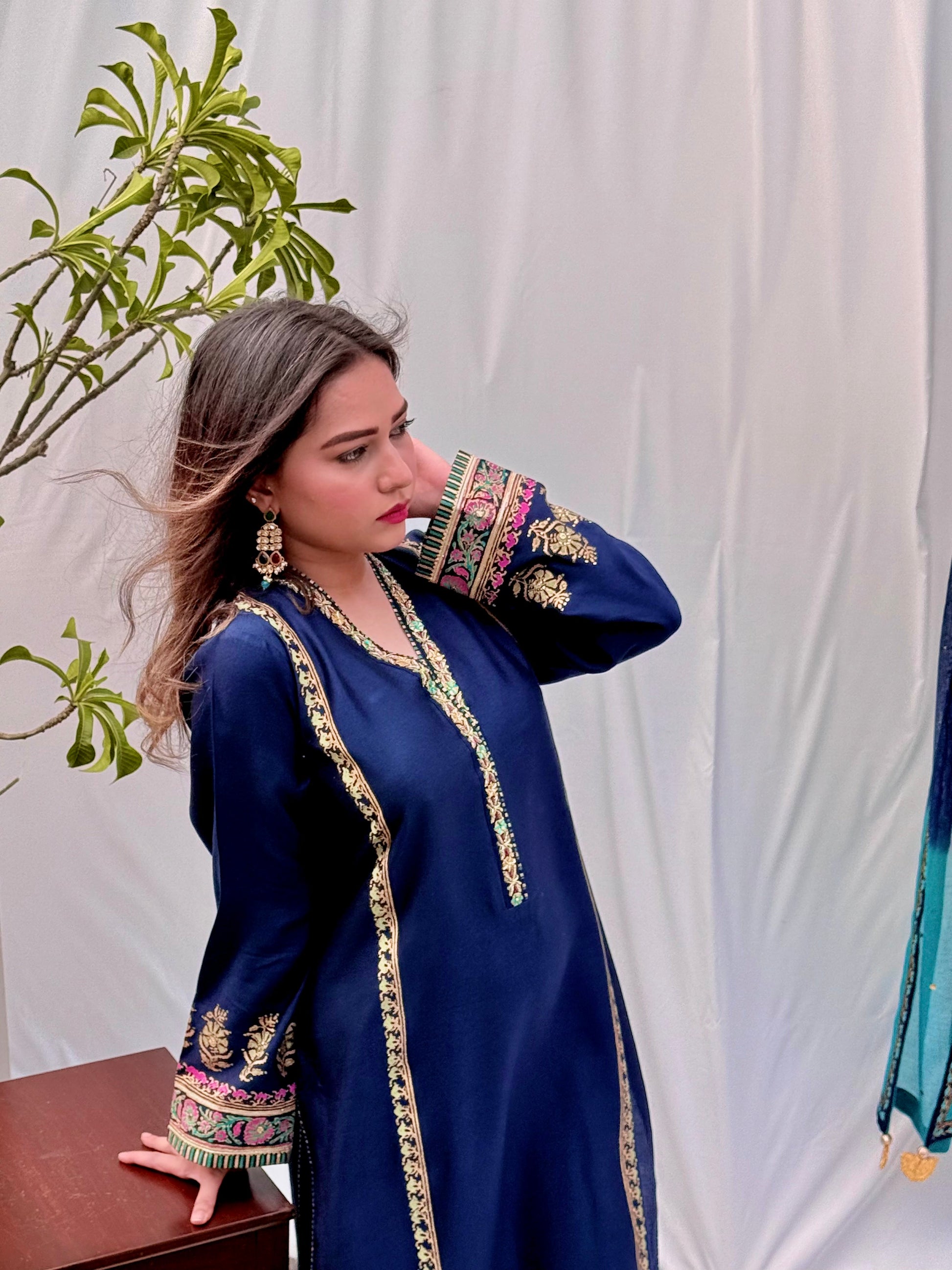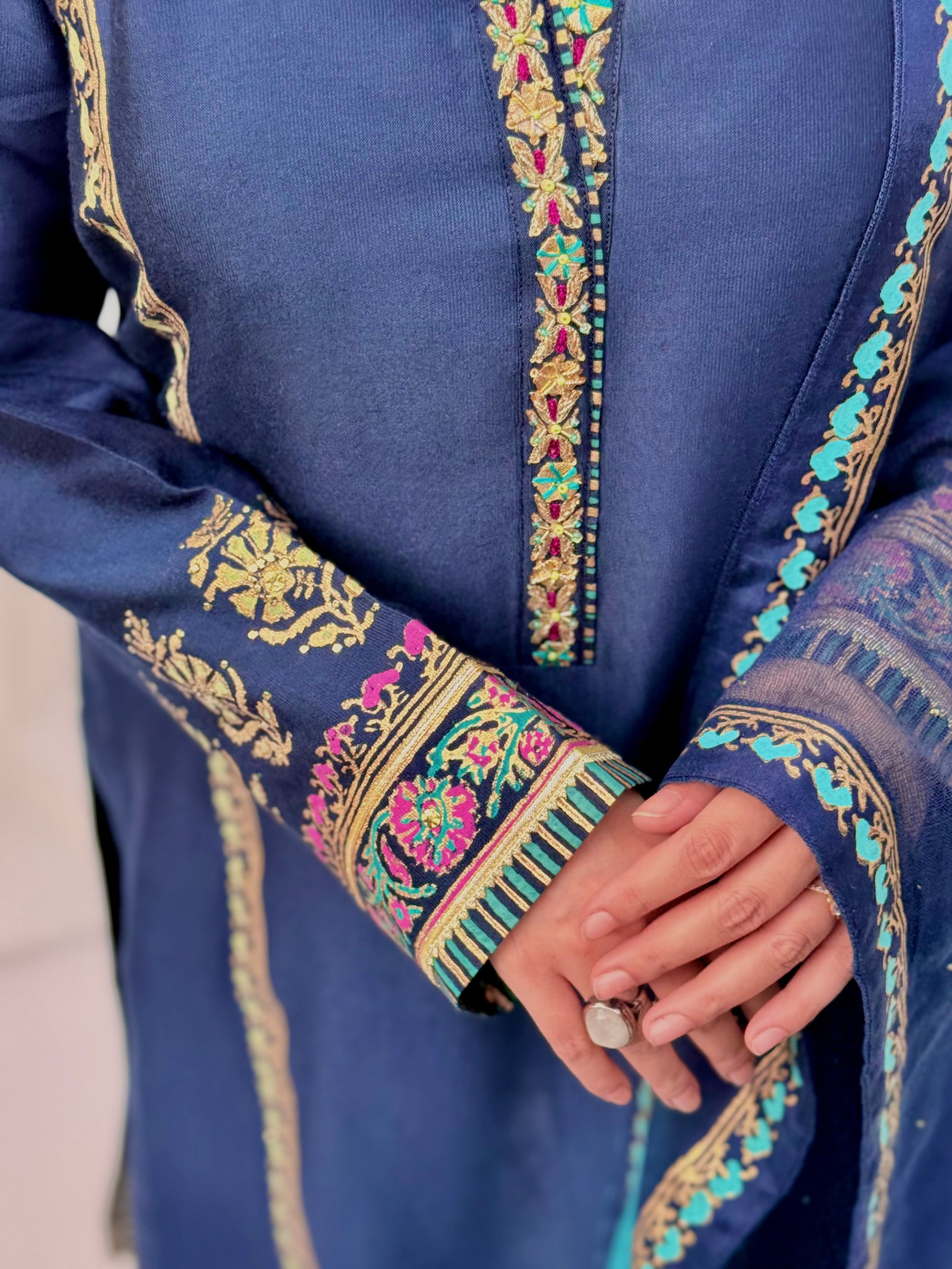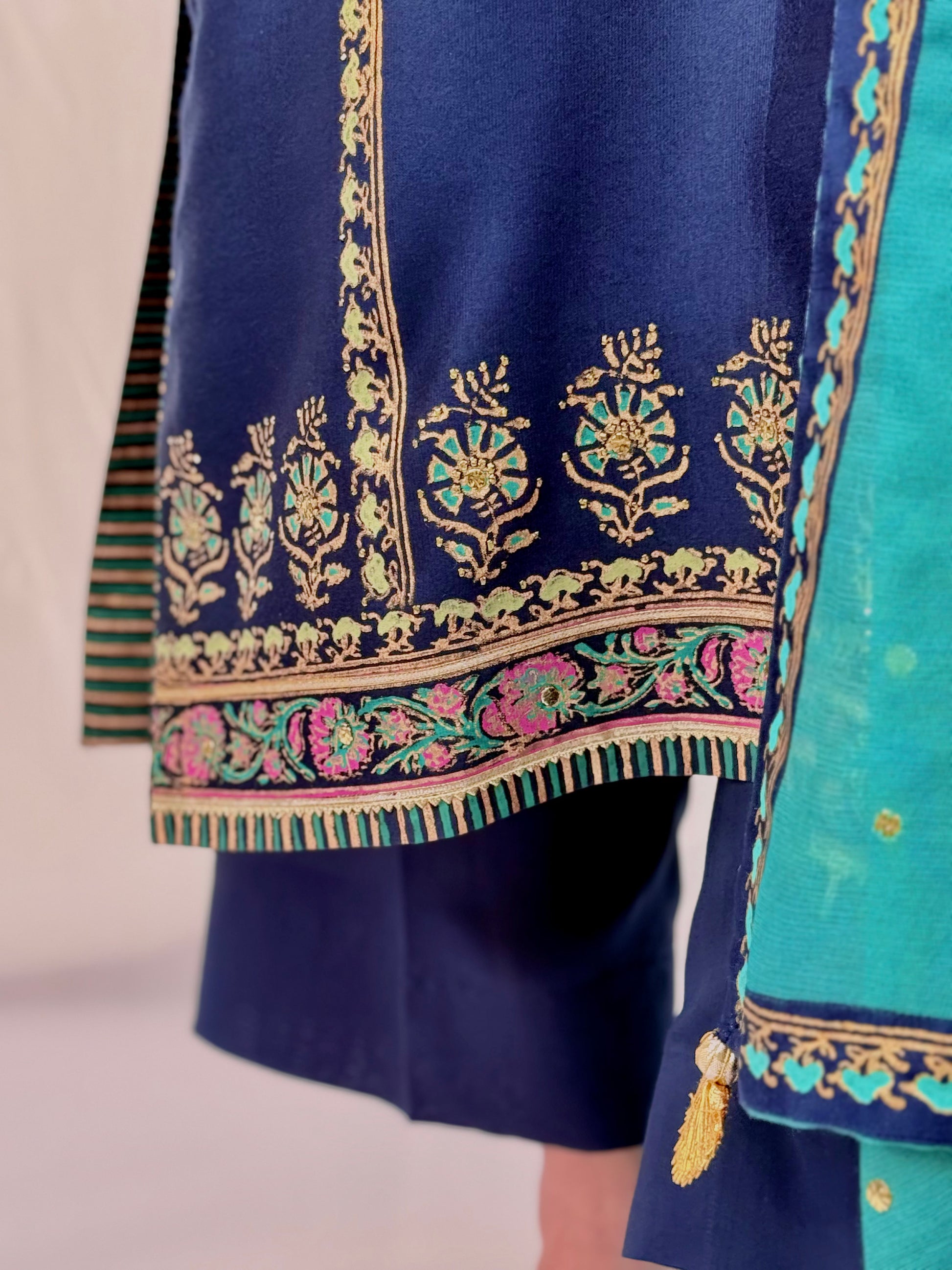 Experience elegance with CHAMBELI, crafted in luxurious sheesha silk fabric paired with a delicate net dupatta. The shirt features intricate blockprint complemented by exquisite hand embroidery on the neckline. Detailed kamdaani work adorns the sleeves and daaman, adding a refined touch to this sophisticated ensemble. Perfect for those who appreciate artistry and subtle opulence.