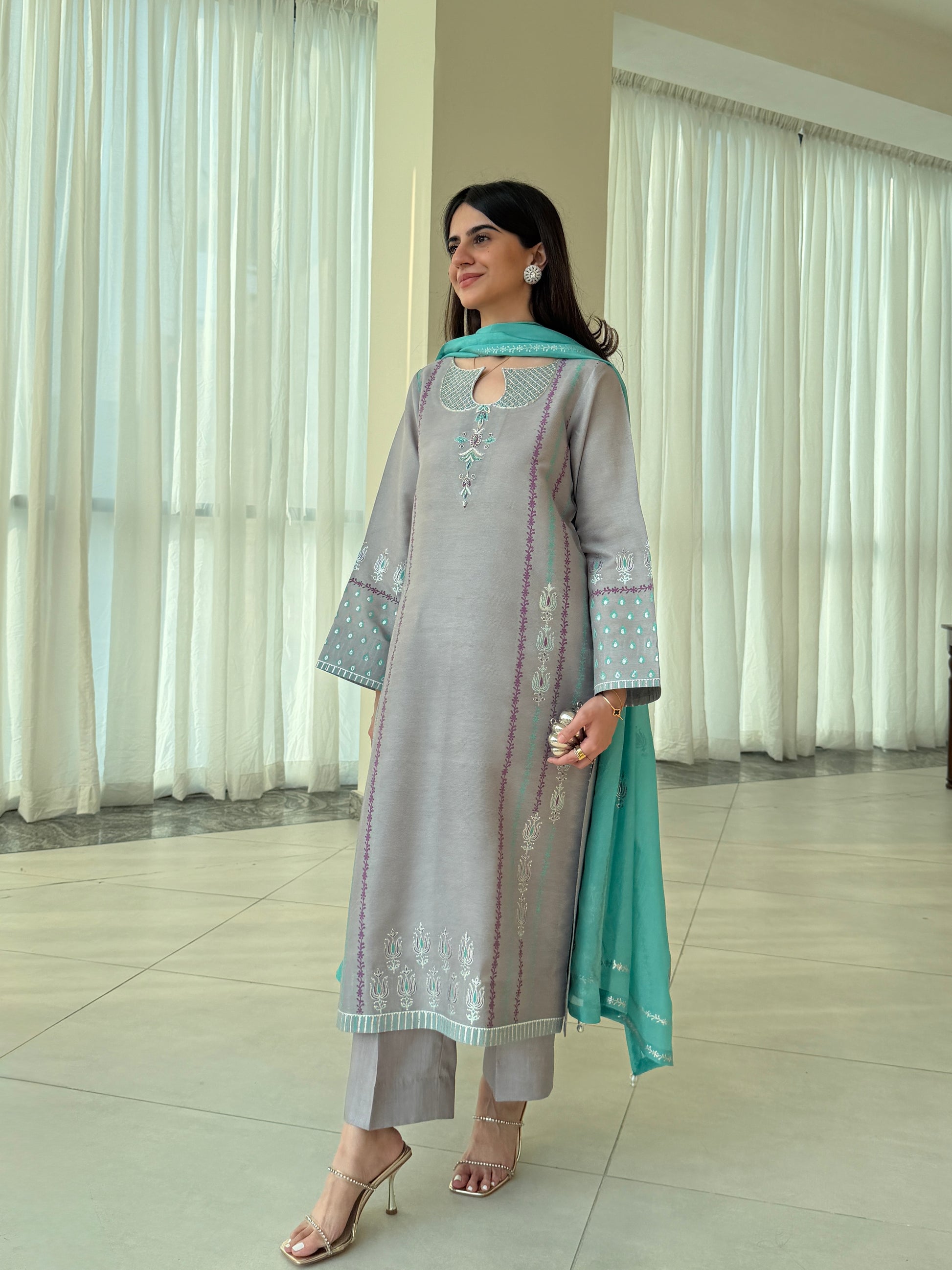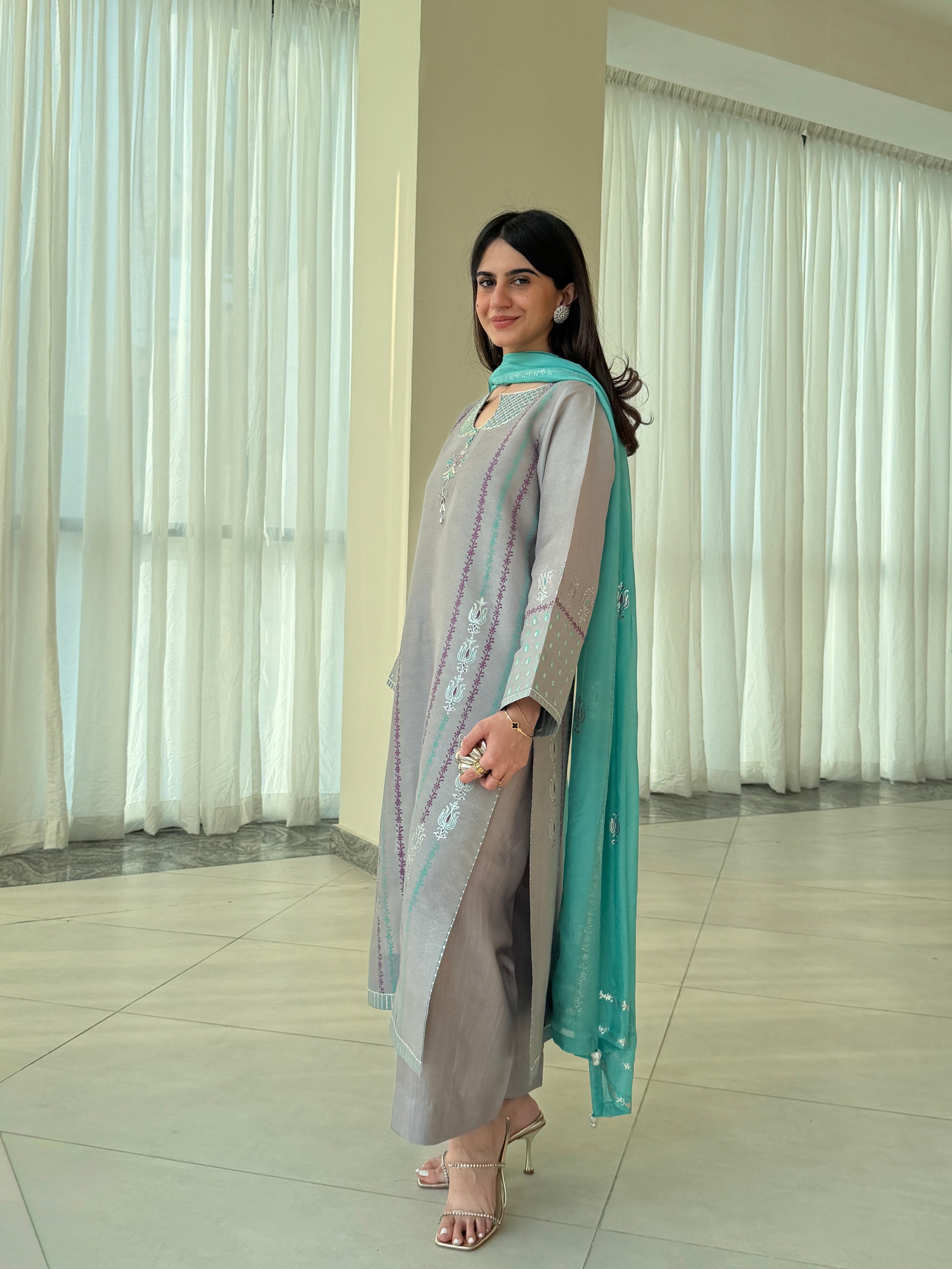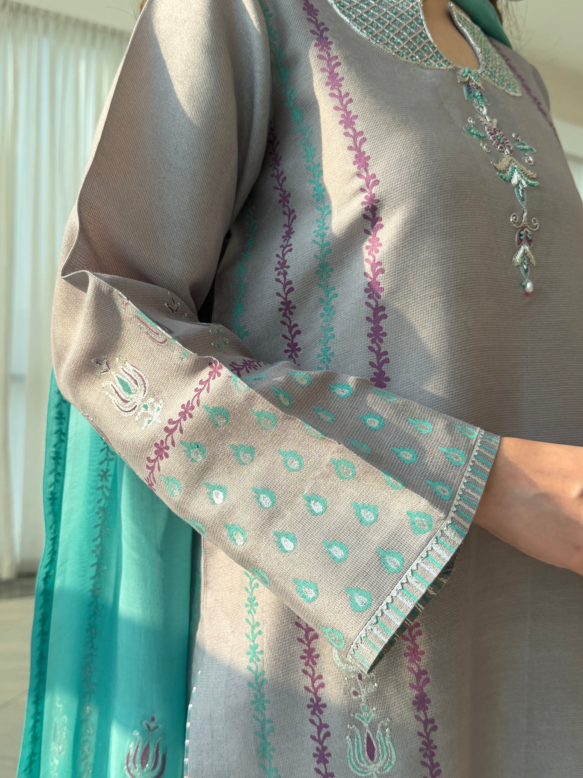 Embrace understated luxury with this three-piece ensemble crafted from premium sheesha silk. The shirt's neckline showcases comprehensive block-printing that introduces visual interest through traditional techniques, while the chiffon silk dupatta provides an ethereal counterpoint with its graceful movement. Fully stitched and ready to wear, this collection balances bold detailing with refined restraint—ideal for those who seek distinctive style without excess. A sophisticated choice that transcends occasion and season.