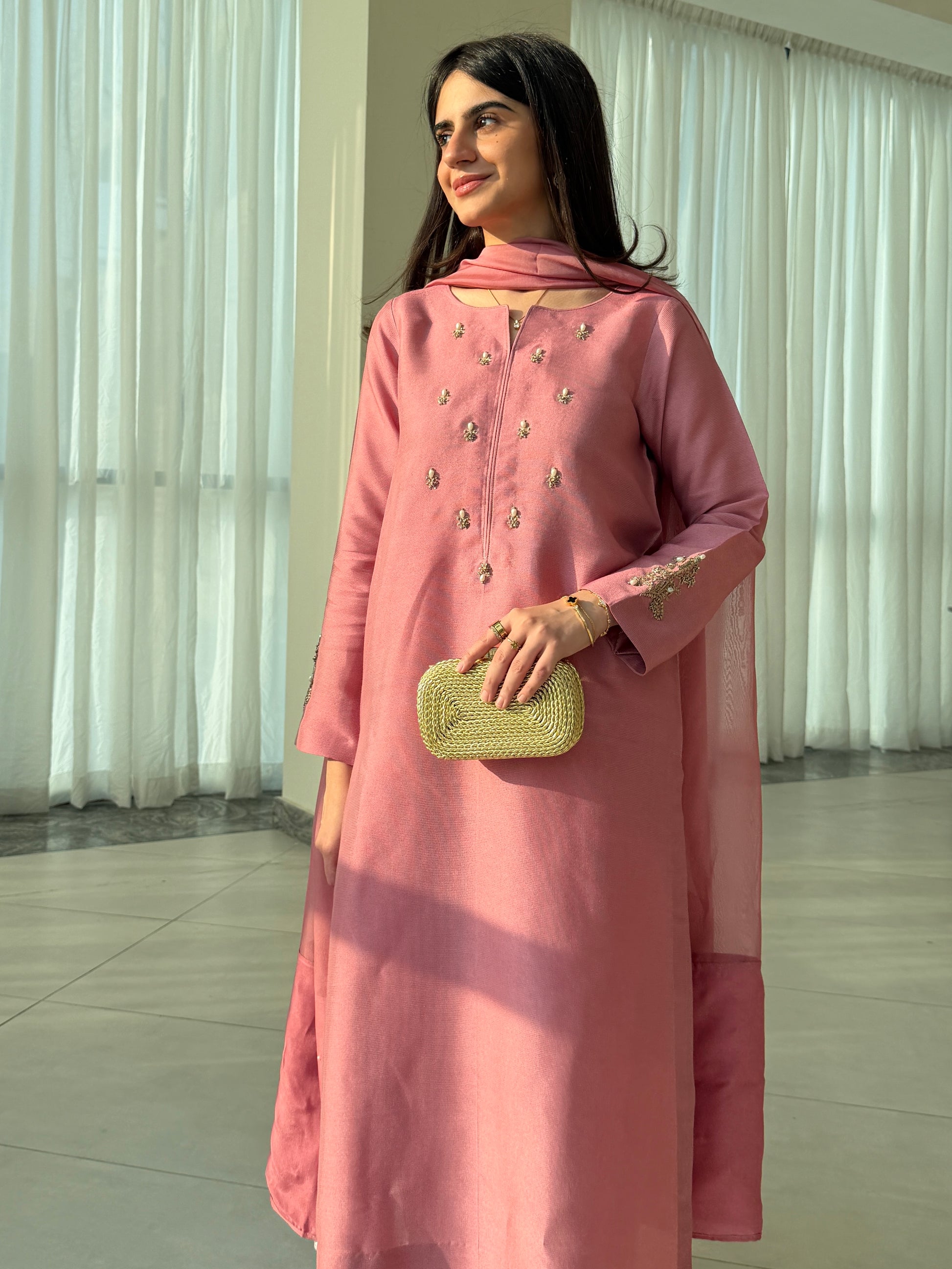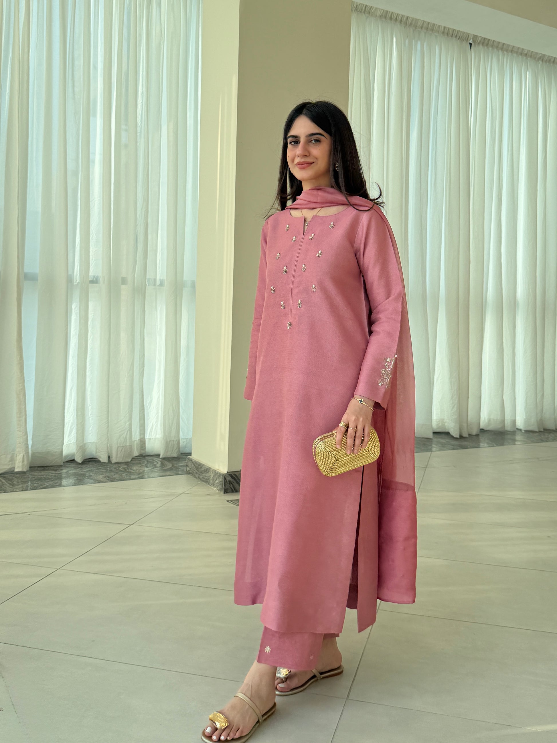 Indulge in comprehensive elegance with this three-piece collection rendered entirely in luxurious sheesh silk. Meticulous embellishment adorns every element—the shirt, trouser hem, and dupatta—creating a unified composition of refined artistry. Each piece is pre-stitched for effortless sophistication, allowing you to transition seamlessly through your day with polished grace. This ensemble exemplifies the philosophy that true luxury lies in attention to detail and premium craftsmanship throughout, making it an investment in timeless style.