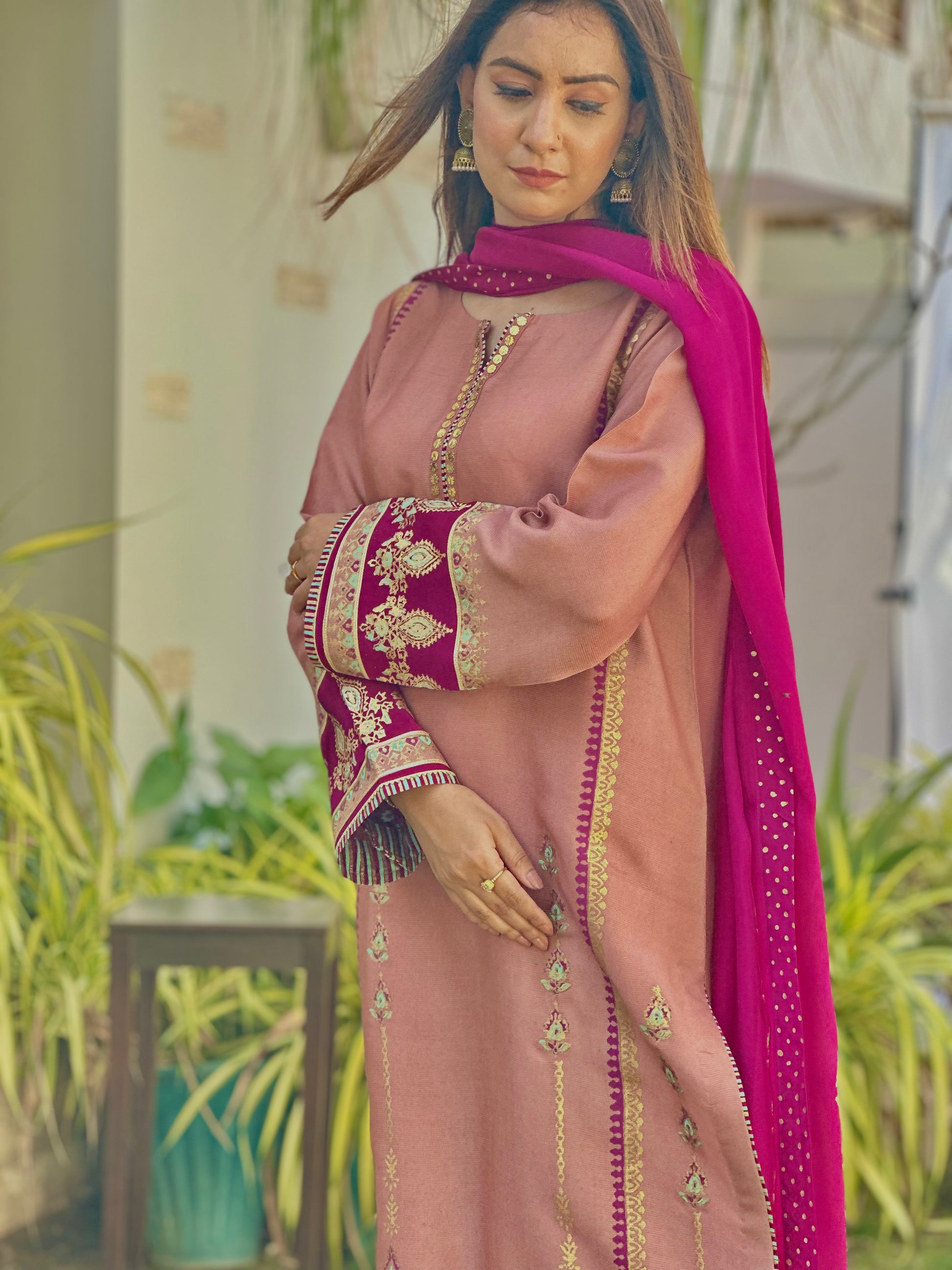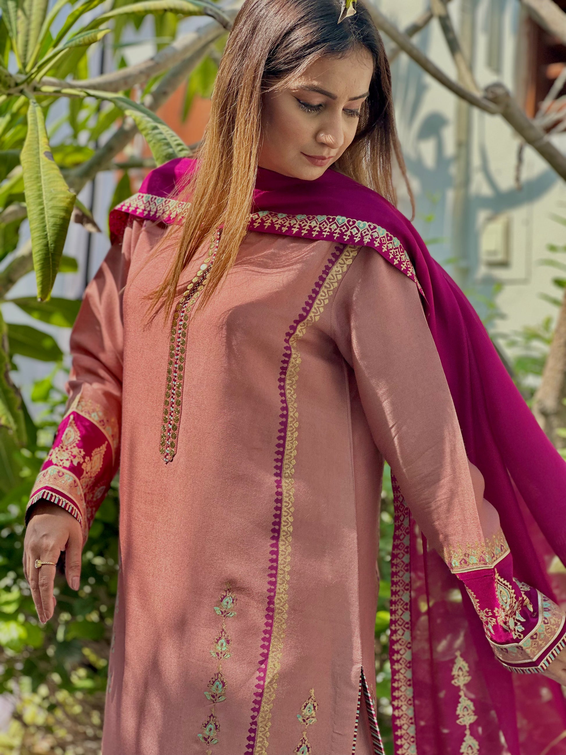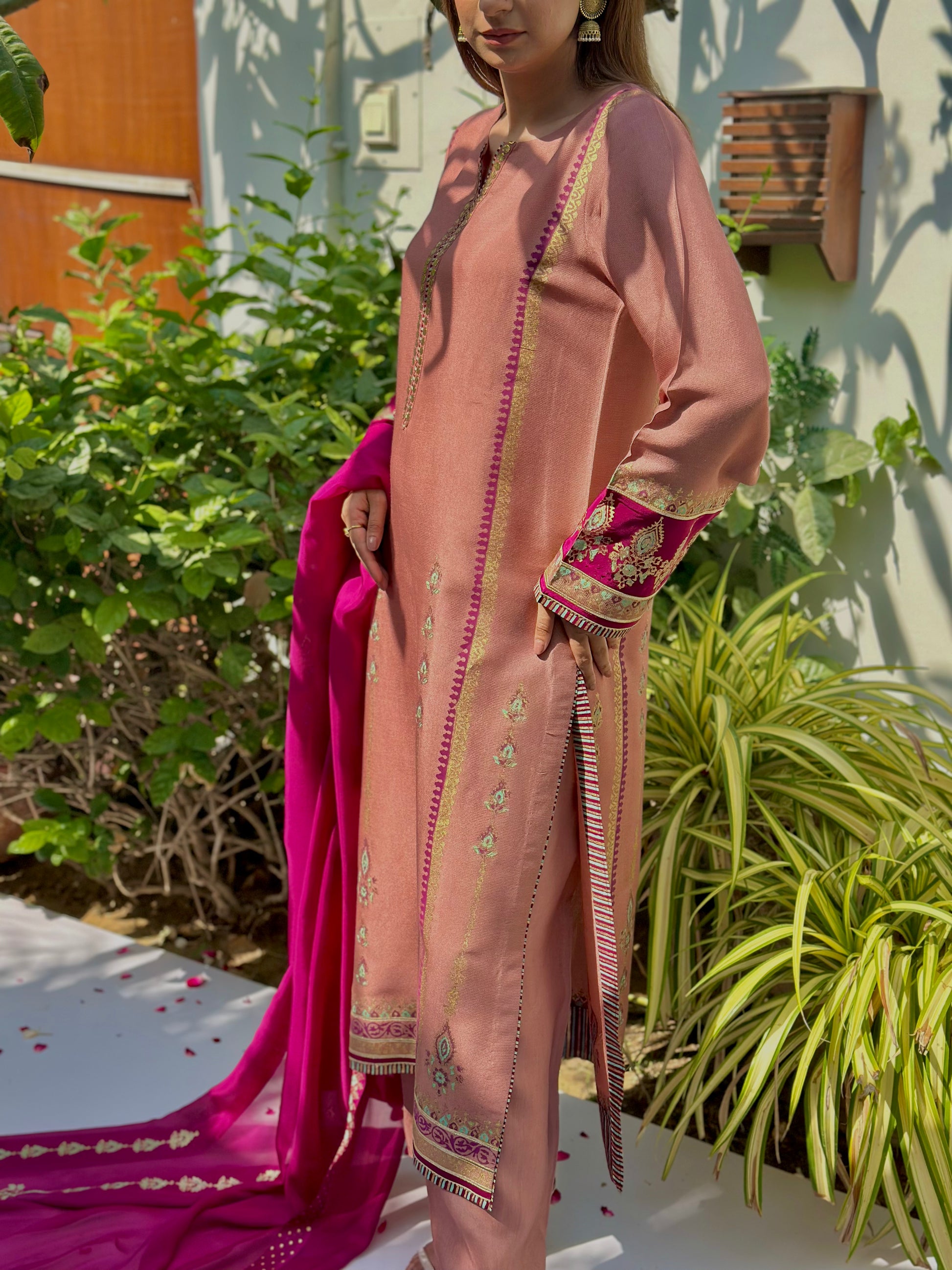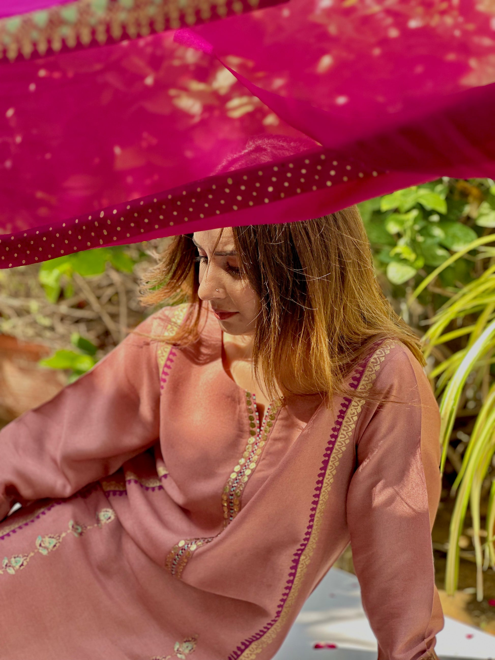 Elevate your wardrobe with HEER, a refined shirt crafted from exquisite kamdaani sheesha silk featuring intricate blockprint detailing. Paired gracefully with a delicate chiffon silk dupatta, this ensemble offers unmatched elegance and a luxurious feel, perfect for sophisticated occasions.
