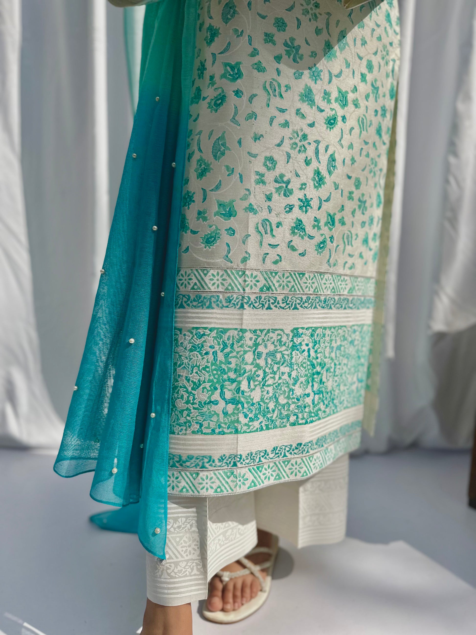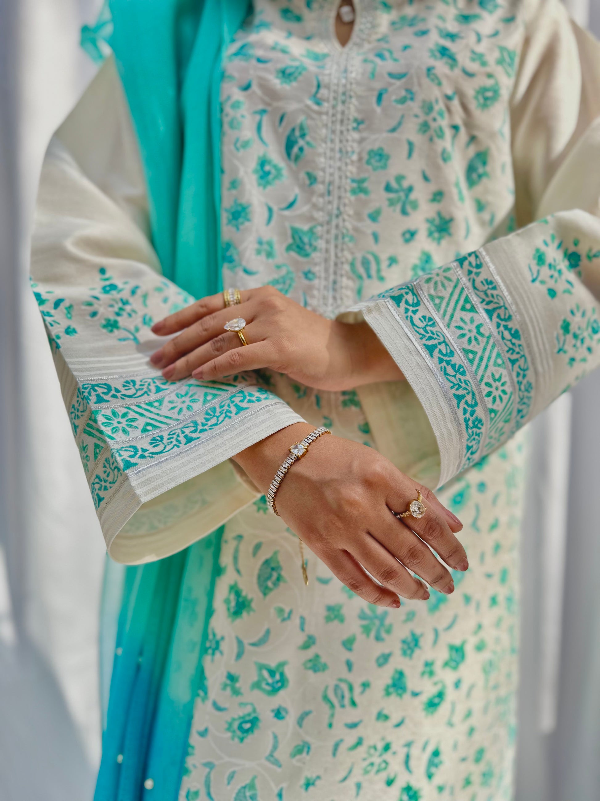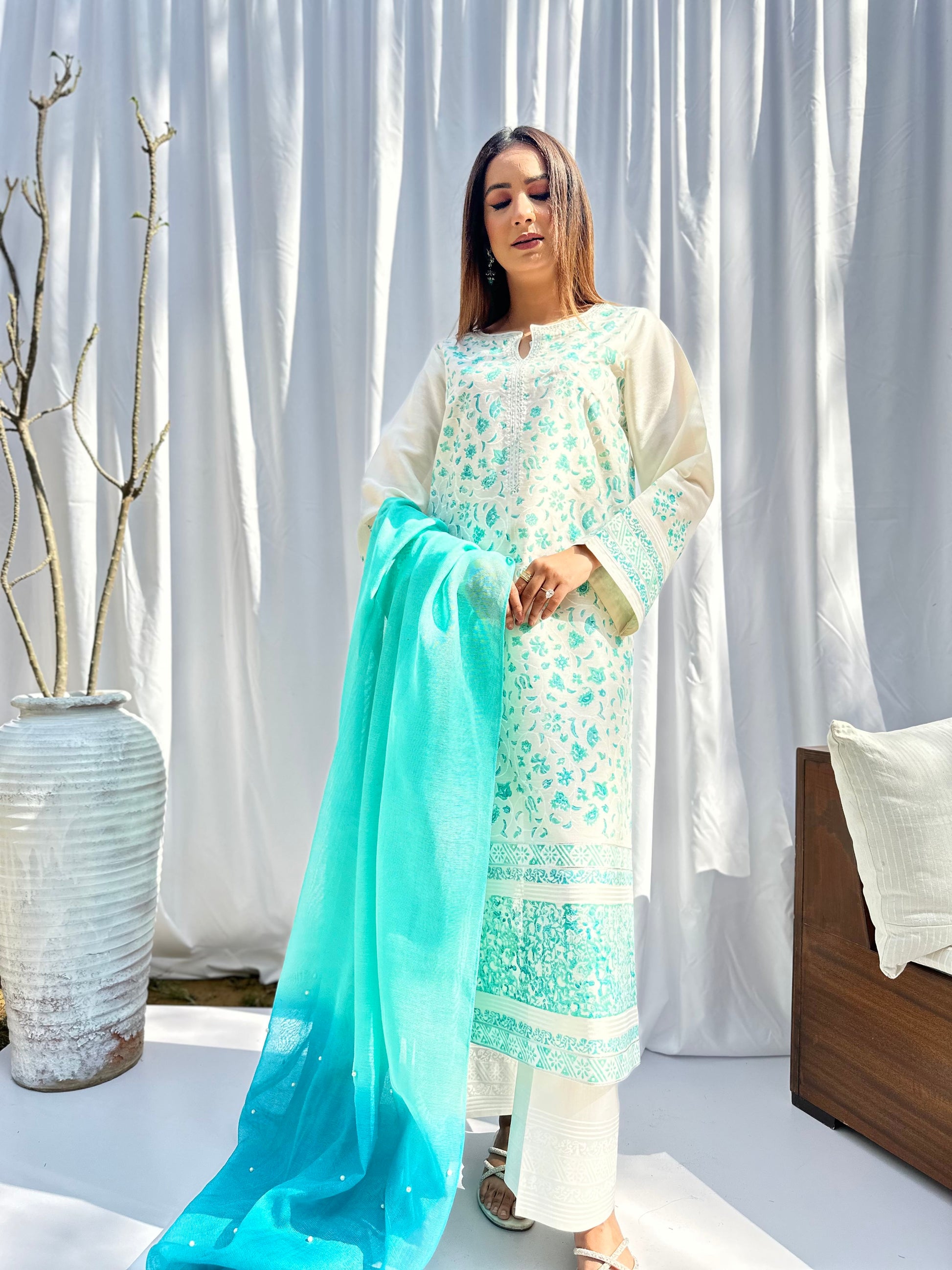 Experience elegance with the LINA ensemble, featuring a luxurious Khaddi silk shirt paired with a delicate Khaddi net two-tone dupatta. The water-based block print adds an artisanal touch, blending tradition with contemporary style. This refined combination offers comfort and sophistication, perfect for making a graceful statement at any occasion.