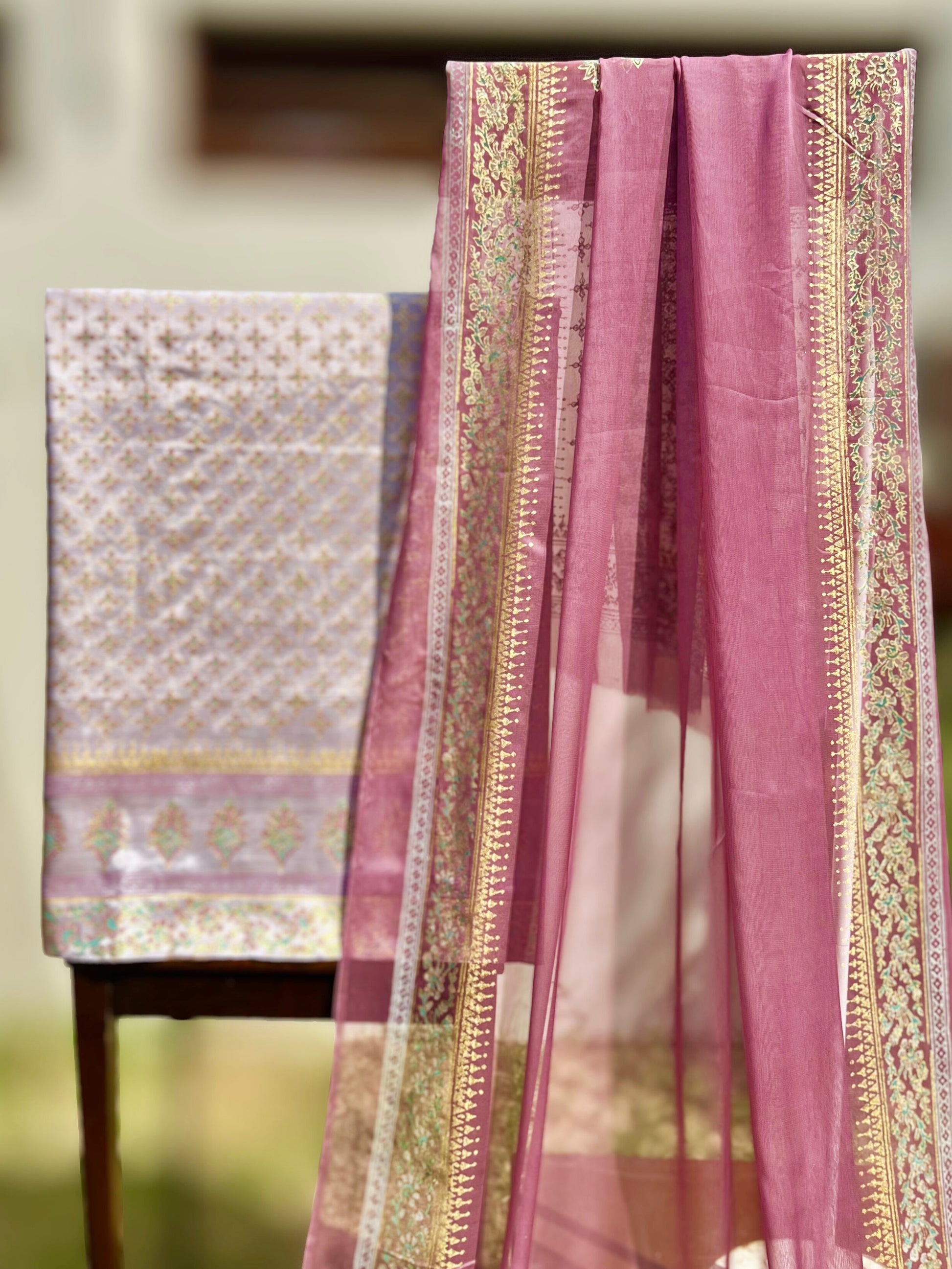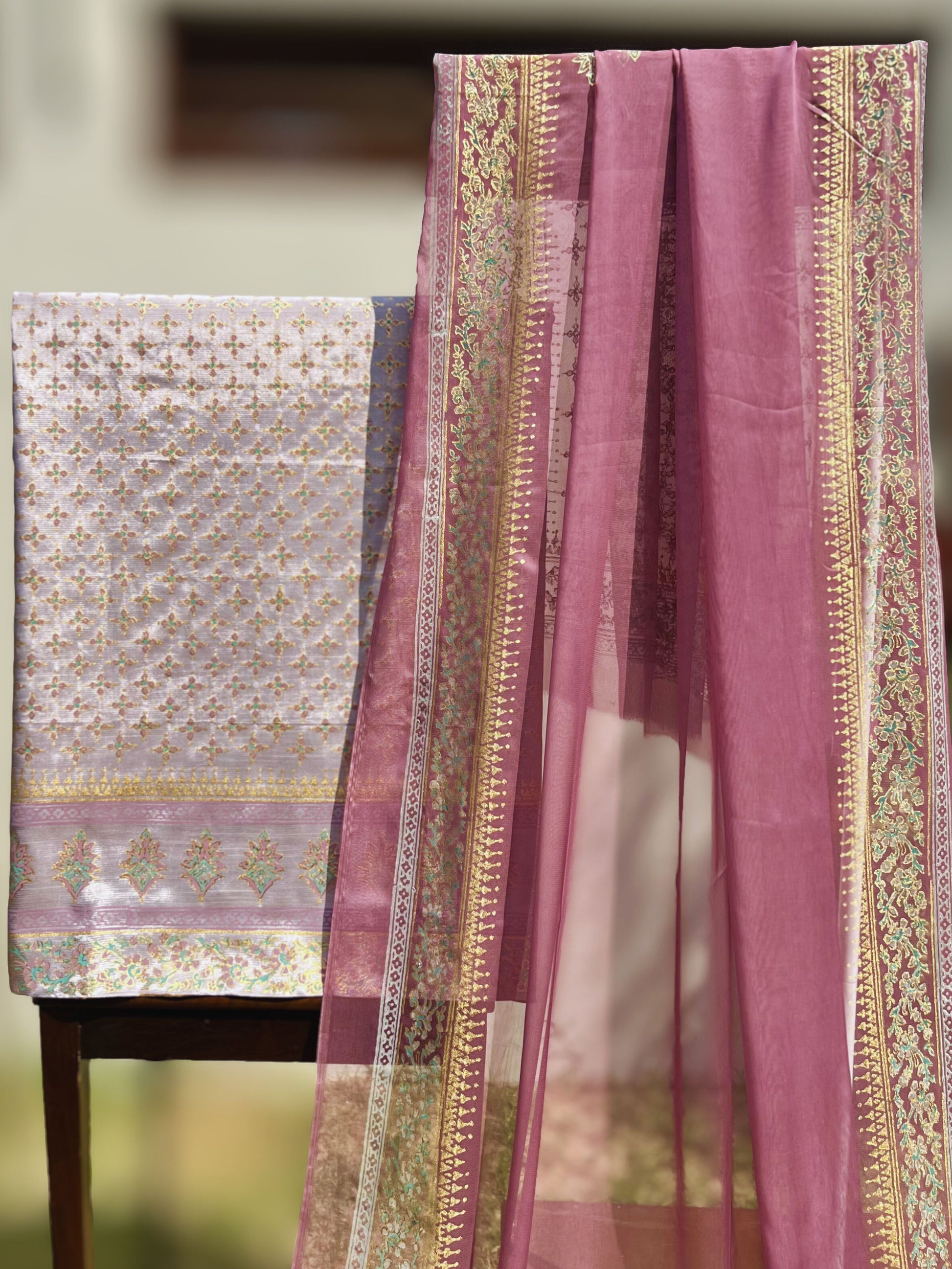 Elevate your wardrobe with this exquisite three-piece ensemble crafted from luxurious raw silk. The intricately printed fabric showcases refined artistry, while the unstitched cut offers complete creative freedom for personalized tailoring. Paired with an ethereal chiffon dupatta, this collection embodies timeless elegance and contemporary sophistication. Perfect for those who appreciate quality craftsmanship and distinctive style.