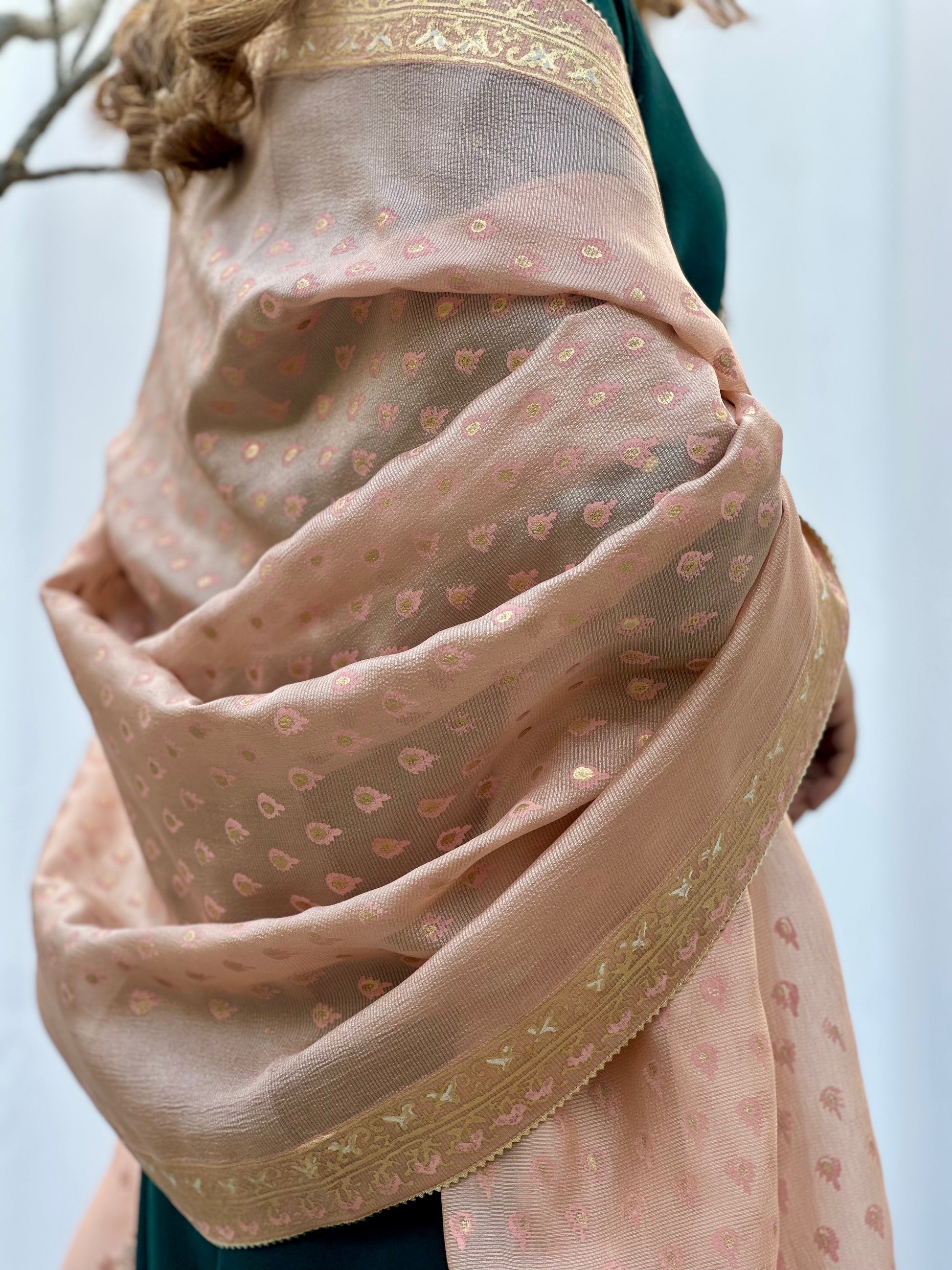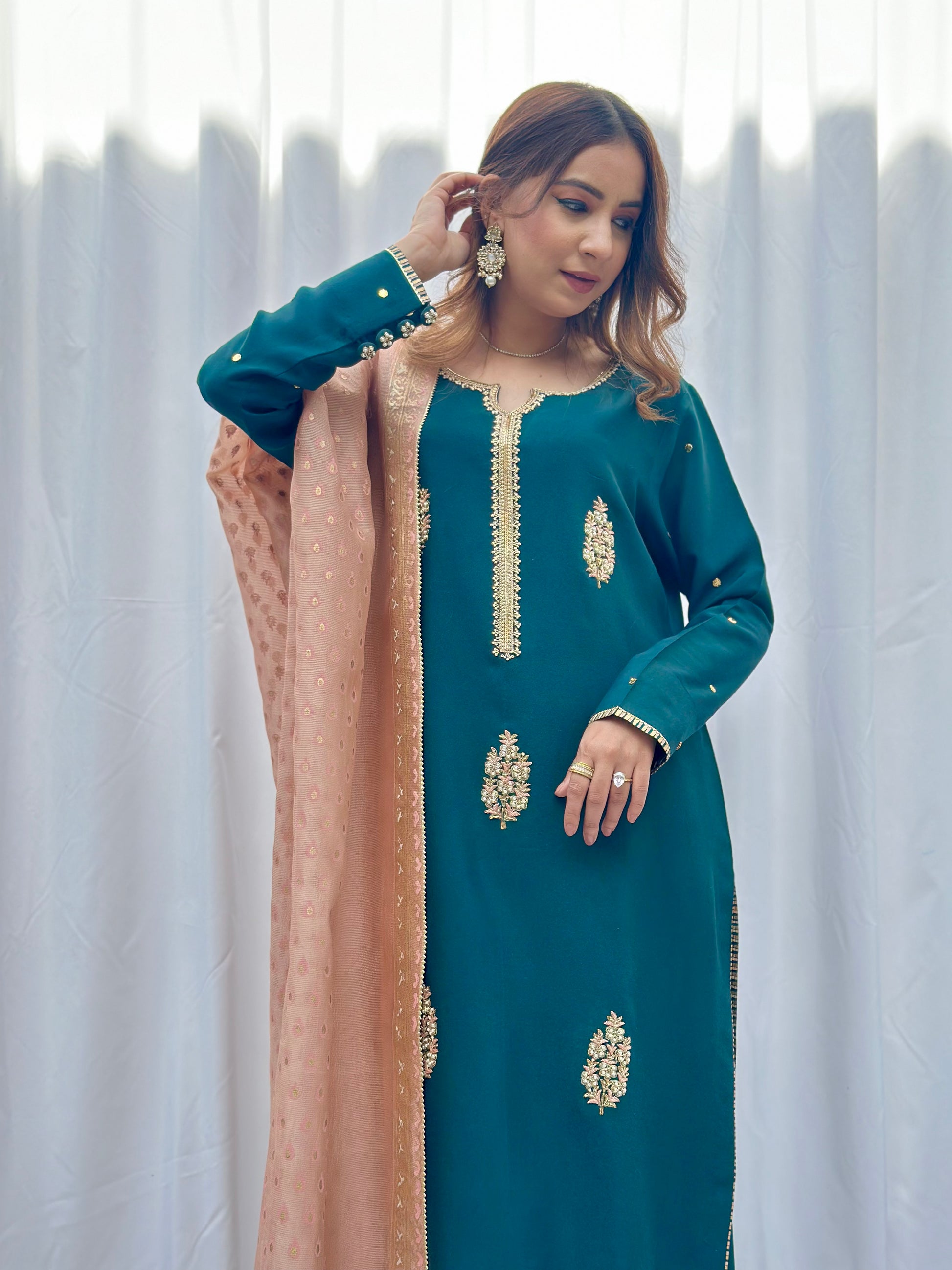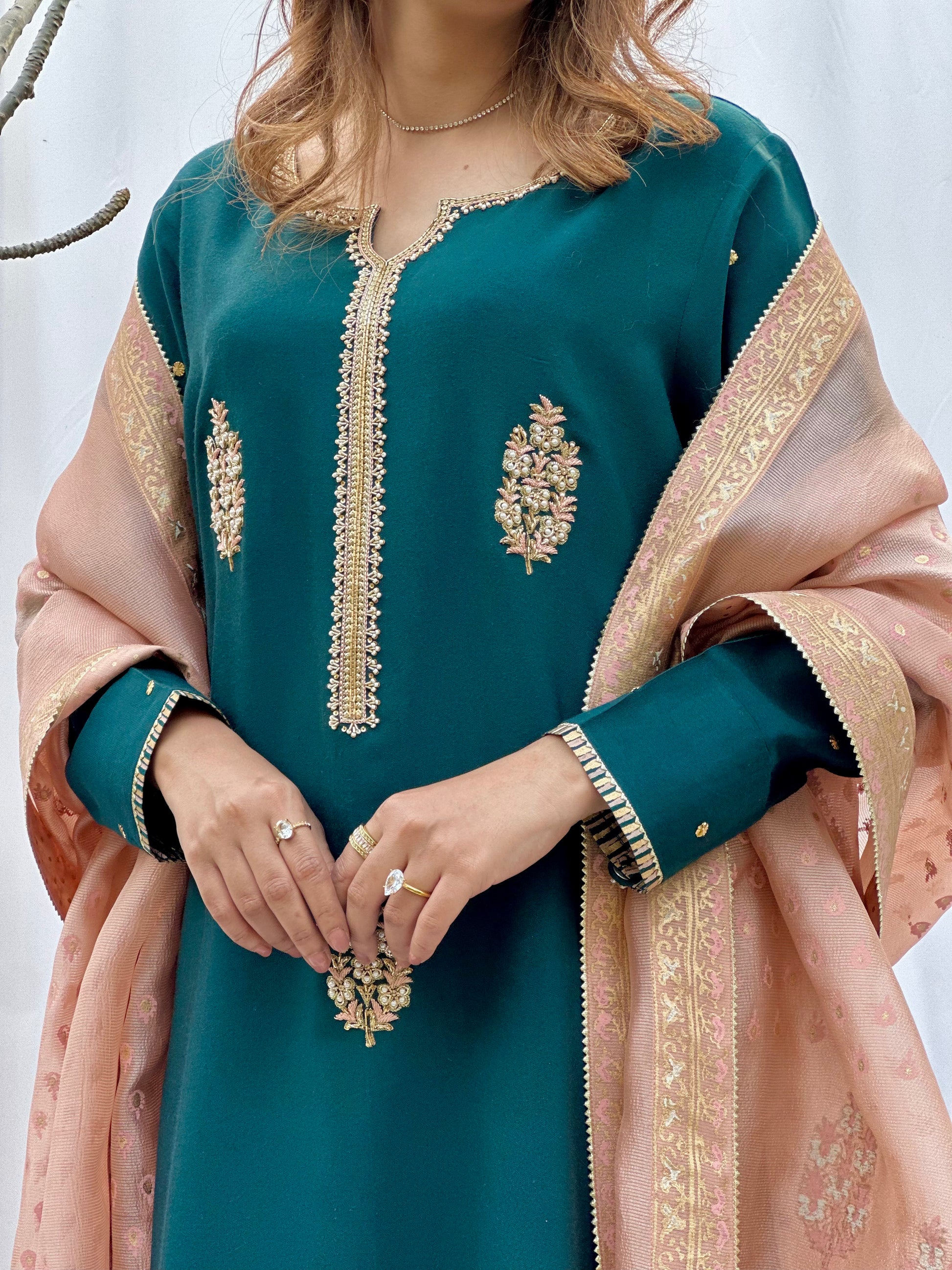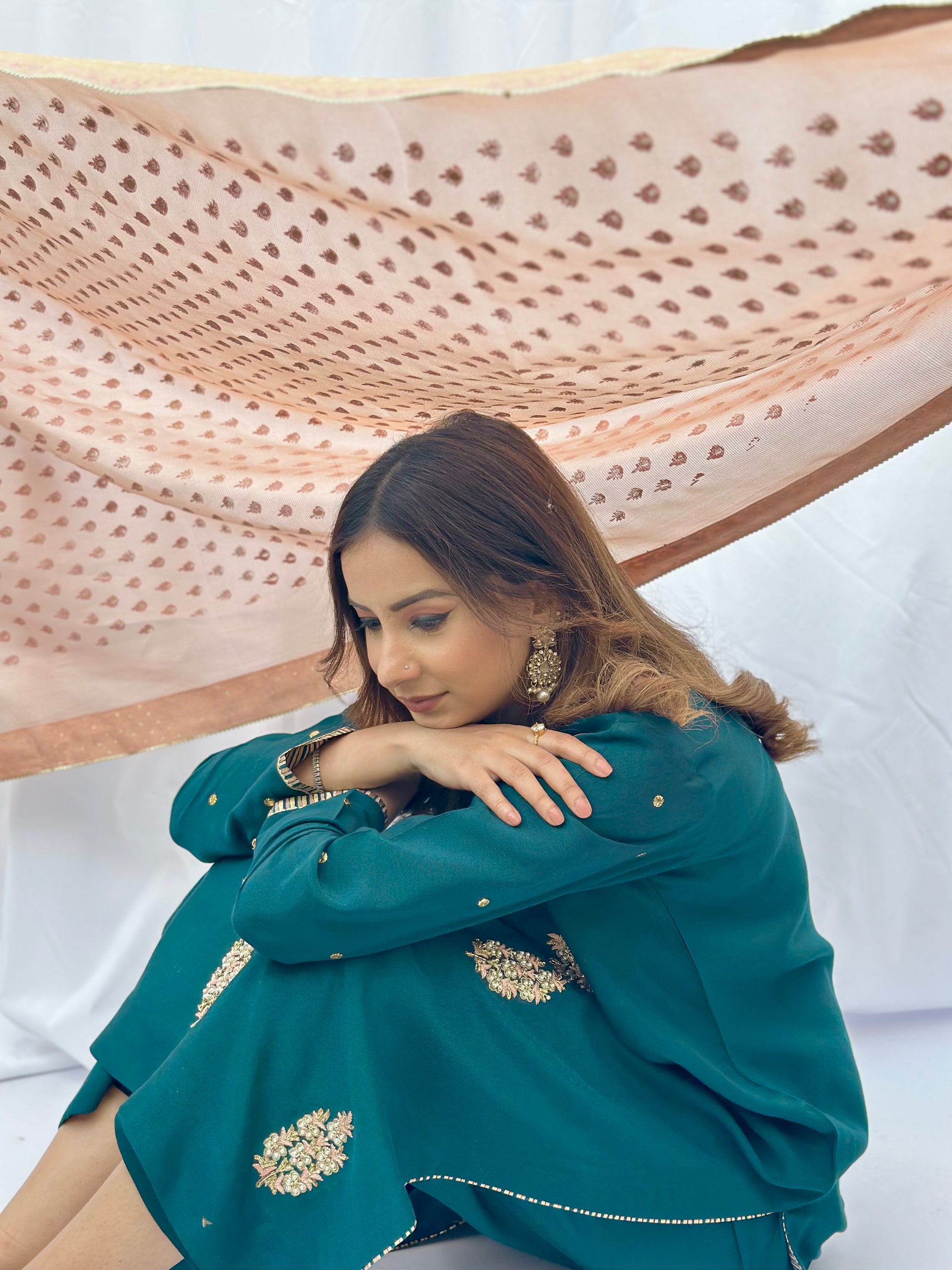 Elevate your wardrobe with MAYA, a long shirt crafted in luxurious deep teal sheesha silk, adorned with fully embroidered motifs for an exquisite finish. This elegant piece pairs seamlessly with matching culottes and a blush pink blockprinted sheesha silk dupatta, blending rich texture and subtle hues. Perfect for sophisticated occasions, this ensemble offers timeless grace and refined style.