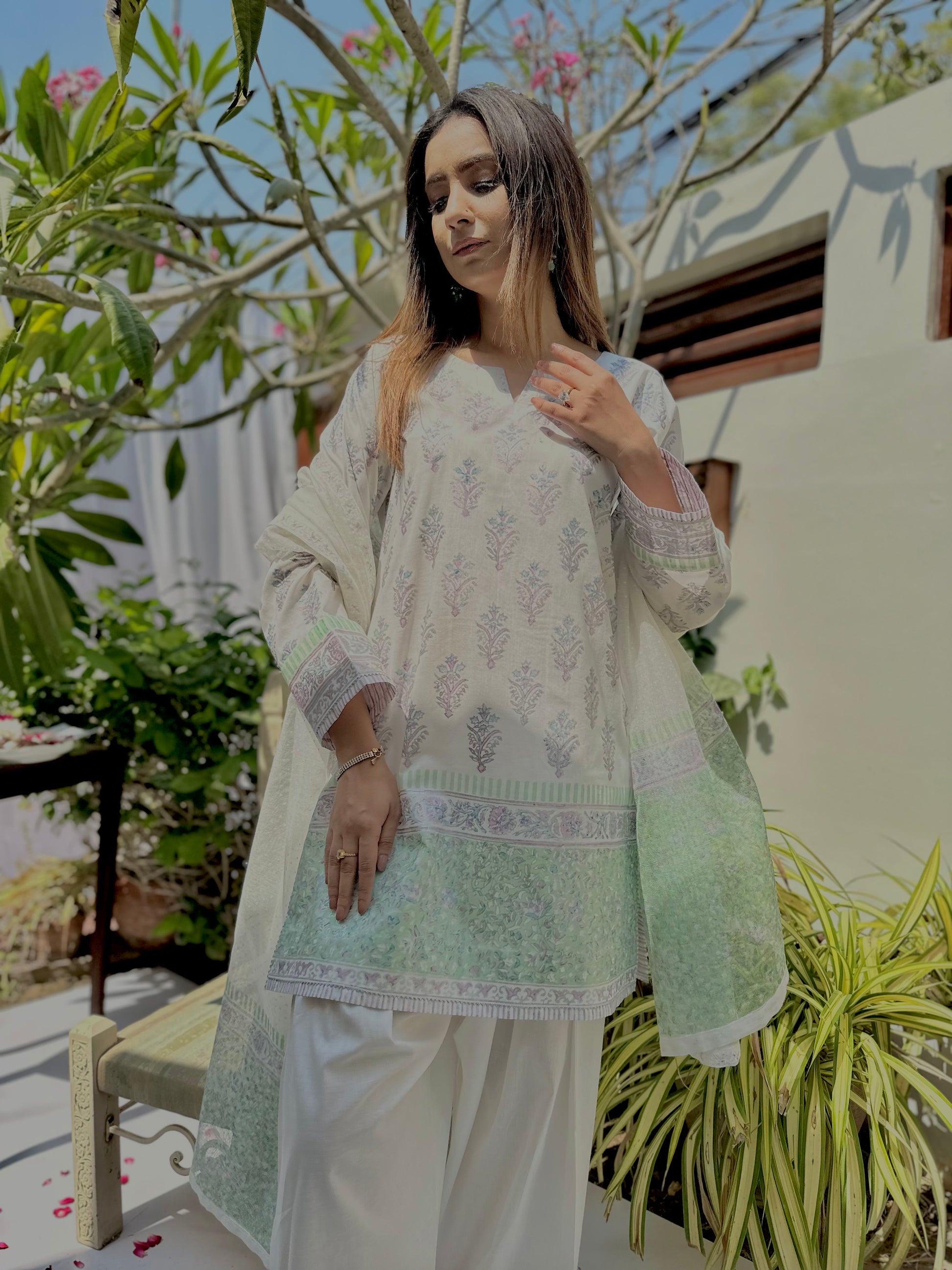 Experience elegance with NOOR, featuring a Khaddi Silk shirt paired with a Khaddi Net dupatta, both adorned with intricate block prints. This ensemble combines traditional craftsmanship with refined textures, offering a sophisticated look perfect for special occasions. The breathable fabrics ensure comfort while highlighting timeless style.